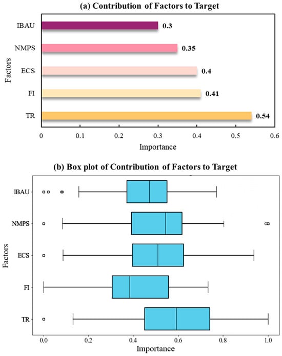 Based on the response relationship established by the SVM model, the LightGBM model was further used to quantitatively analyze the primary driving factors and their contributions to changes in water environmental quality of the YRB [52,53,54]. The results of the final GBM model are shown in Figure 9a, all the selected digital economy indicators contribute more than 30% to the water environmental quality of the YRB. Among them, TR, FI, and ECS were the key factors. TR was the factor with the highest contribution to the prediction of the WQI. That is, the total telecommunication service revenue was the most sensitive in the prediction model, with a contribution degree of 0.54 (approximately 54%). In addition, the contributions of the other two groups of variables, FI and ECS, to the water quality of the YRB were 0.411 (approximately 41%) and 0.403 (approximately 40%), respectively, second only to that of TR, indicating that the comprehensive impact of the digital economy also made a relatively significant contribution. The contributions of NMPS and IBAU to the water environmental quality were relatively small, with contribution coefficients of 0.348 (approximately 35%) and 0.298 (approximately 30%), respectively.