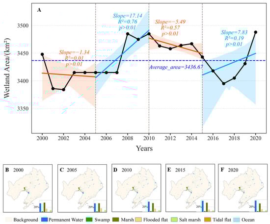Spatial and temporal evolution of wetland patterns in Liaoning Province from 2000 to 2020 (A): Wetland area change; (B–F): Wetland types and their area percentages in 2000, 2005, 2010, 2015, and 2020, respectively.