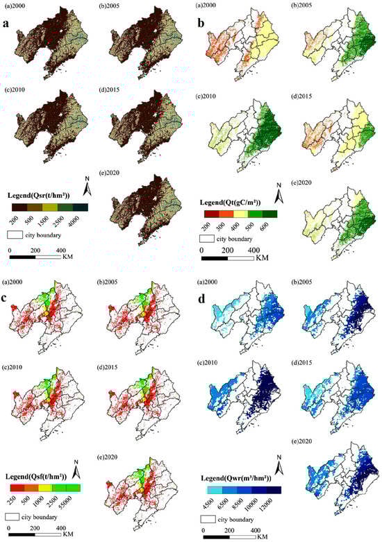 Ecosystem Service Functions of Wetlands in Liaoning Province in 2000, 2005, 2015, and 2020. (a) Soil Conservation Function (Qsr); (b) Carbon Storage (Qt); (c) Wind Erosion Control (Qsf); (d) Water Retention (Qwr).