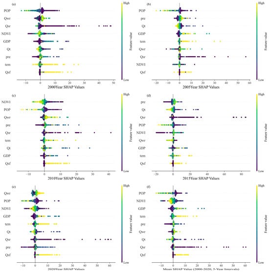 SHAP values of the driving factors influencing wetland distribution pattern changes in Liaoning Province: (a) 2000; (b) 2005; (c) 2010; (d) 2015; (e) 2020; (f) mean SHAP values (2000–2020, 5-year intervals). POP: Population Density; NDVI: Normalized Difference Vegetation Index; GDP: Gross Domestic Product; DEM: Elevation; PRE: Precipitation; Qwr: Water Retention; Qt: Carbon Storage; Qsr: Soil Conservation; Qsf: Wind Erosion Control.