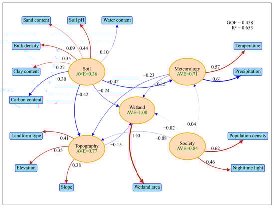 The partial least squares structural equation model (PLS-PM) is a correlation-based structural equation modeling method, and the model consists of two parts: (1) the external model, which is used to describe the relationship between the observed variables and the latent variables; (2) the internal model, which is used to describe the relationship between the latent variables. variables. Among them, latent variables are constructs that cannot be directly measured but are inferred from observed variables [23]. In this study, we categorized temperature and precipitation as meteorological factors; sand and clay content as soil factors; elevation and slope as topographical factors; and city location and population density as social factors. Each factor not only directly affects the distribution of wetlands but also interacts with each other. PLS-SEM analysis was conducted using the ‘plspm’ package in R to assess the potential relationships among the variables in the study. The coefficient of determination (R2) was used to assess the explanatory power of the model, goodness-of-fit (GOF) was used to measure the overall fit of the model, and average extracted variance (AVE) was used to test the validity of the model.