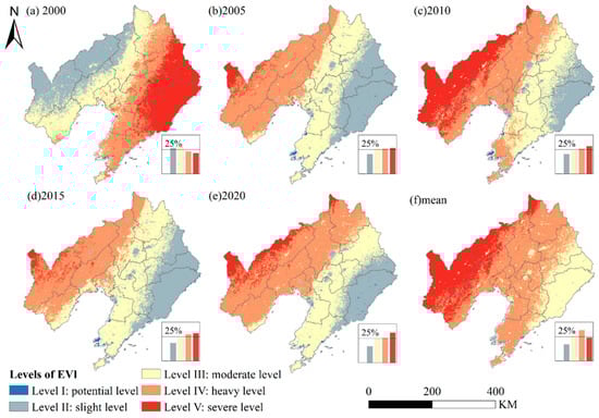 Distribution of ecological vulnerability levels during 2000–2020. (a) Year of 2000. (b) Year of 2005. (c) Year of 2010. (d) Year of 2015. (e) Year of 2020. (f) Average level between 2000 and 2020.