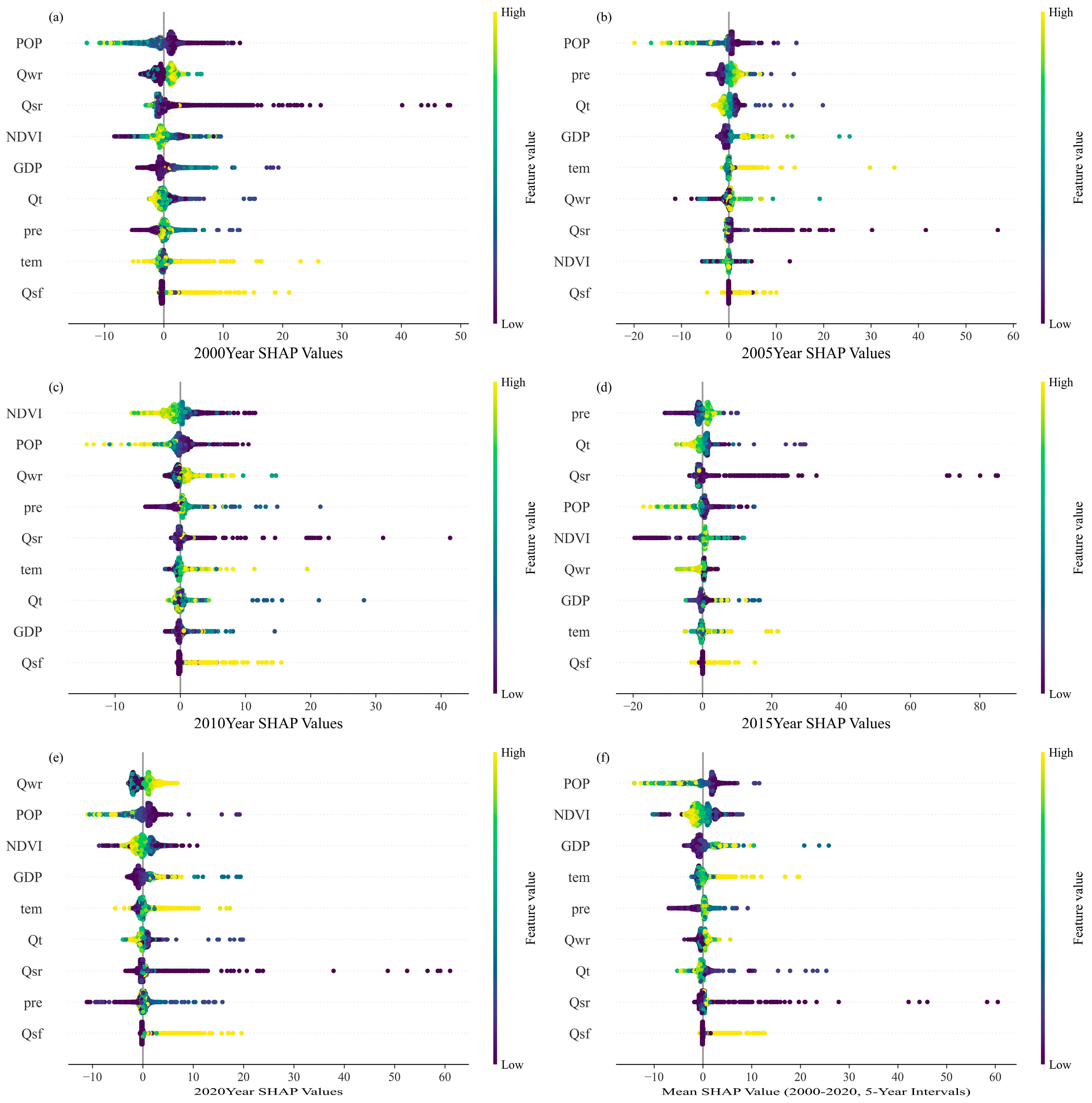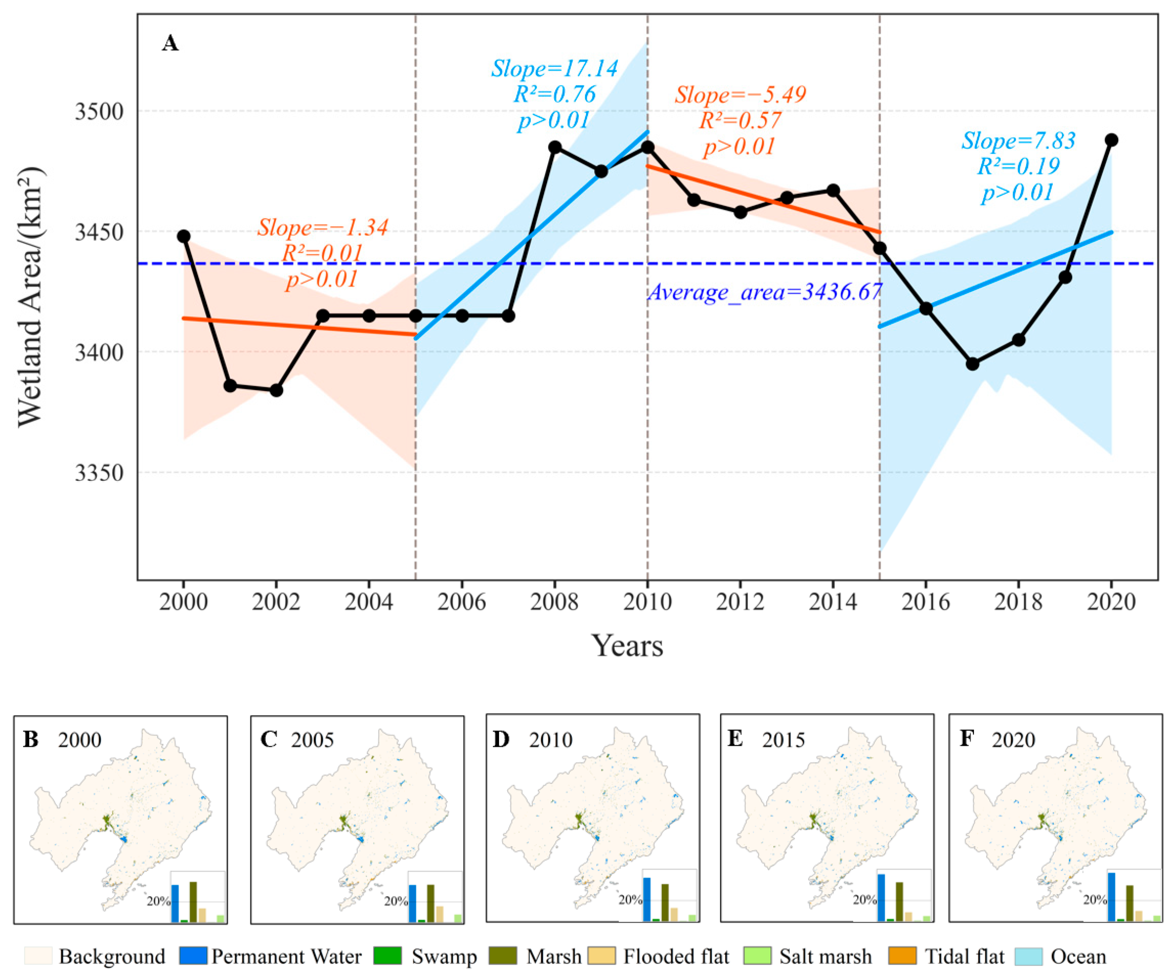 - Population density was the dominant driving factor in the early stage, but with the passage of time, the influence of precipitation, NDVI, GDP and wetland area on the evolution of wetland pattern gradually increased, and the driving mechanism showed significant spatial heterogeneity.