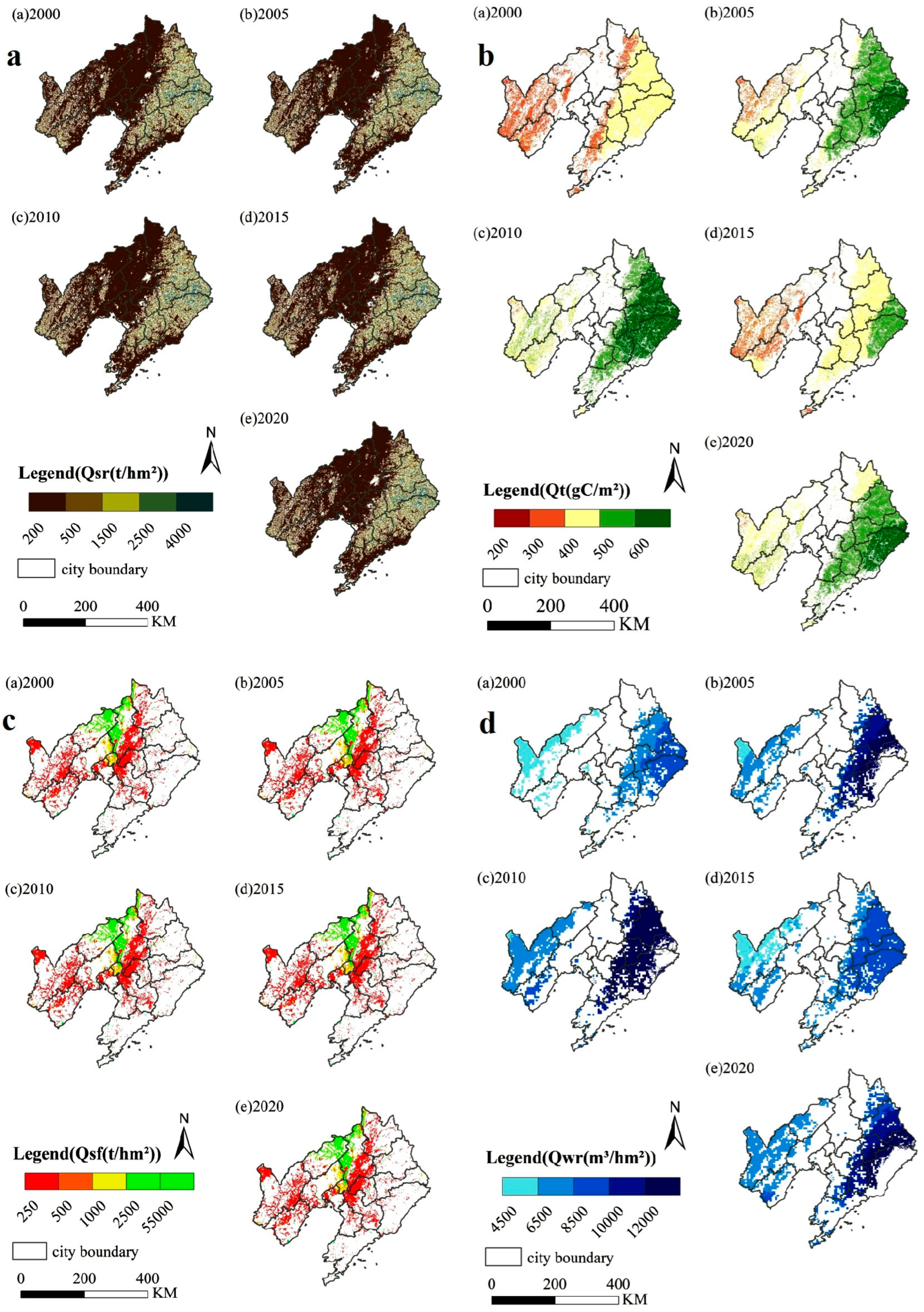 - Carbon storage gradually increased, and water conservation capacity was significantly enhanced in the northern part of the province. In contrast, windbreak, sand fixation, and soil conservation functions declined under the influence of urban expansion and land-use change.