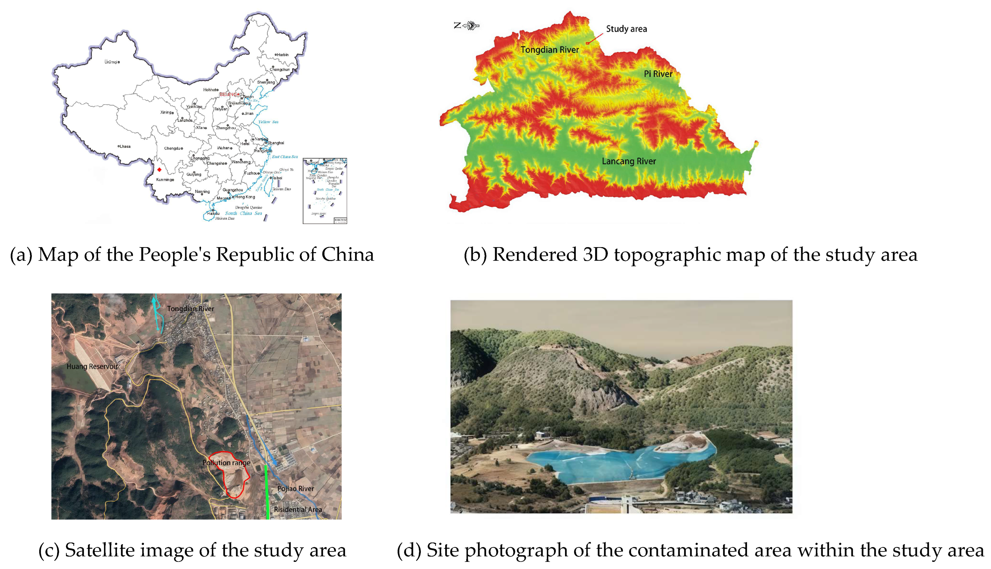 The surface water around the site is developed. The Tongdian River in the north originates from Huangmu village and flows into Tongdian town from south to north. There is the Huangmu reservoir in the northwest, about 1 km away from the slag reservoir. The Pojiao River on the east side is 150 m away from the slag reservoir, which is the main impact water area. The above rivers and reservoirs are the main surface water around the slag reservoir. In addition, there is a flood intercepting ditch on the north side of the slag reservoir, where perennial water flows into the Pojiao River.