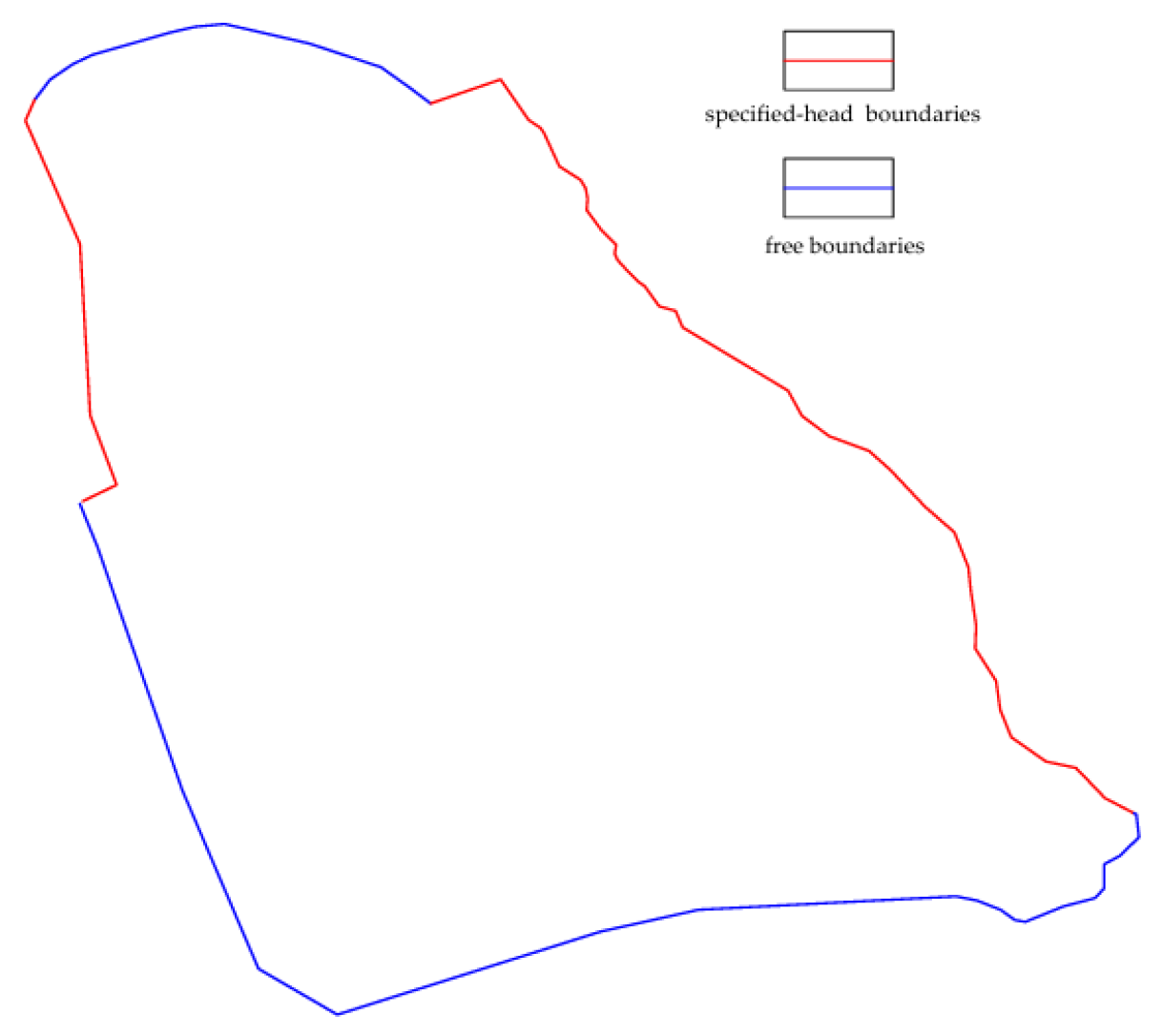 Vertically, the lower model boundary is defined by an impermeable stratigraphic unit, which is implemented as a no-flux boundary condition. The upper boundary incorporates areal recharge from precipitation. Lateral boundaries are delineated by rivers and topographic divides. The eastern river boundary is prescribed as a specified-head condition, as is the western elevated zone due to influence from a reservoir. The northern and southern boundaries are treated as free boundaries, with their flux dynamics controlled by the groundwater flow system (