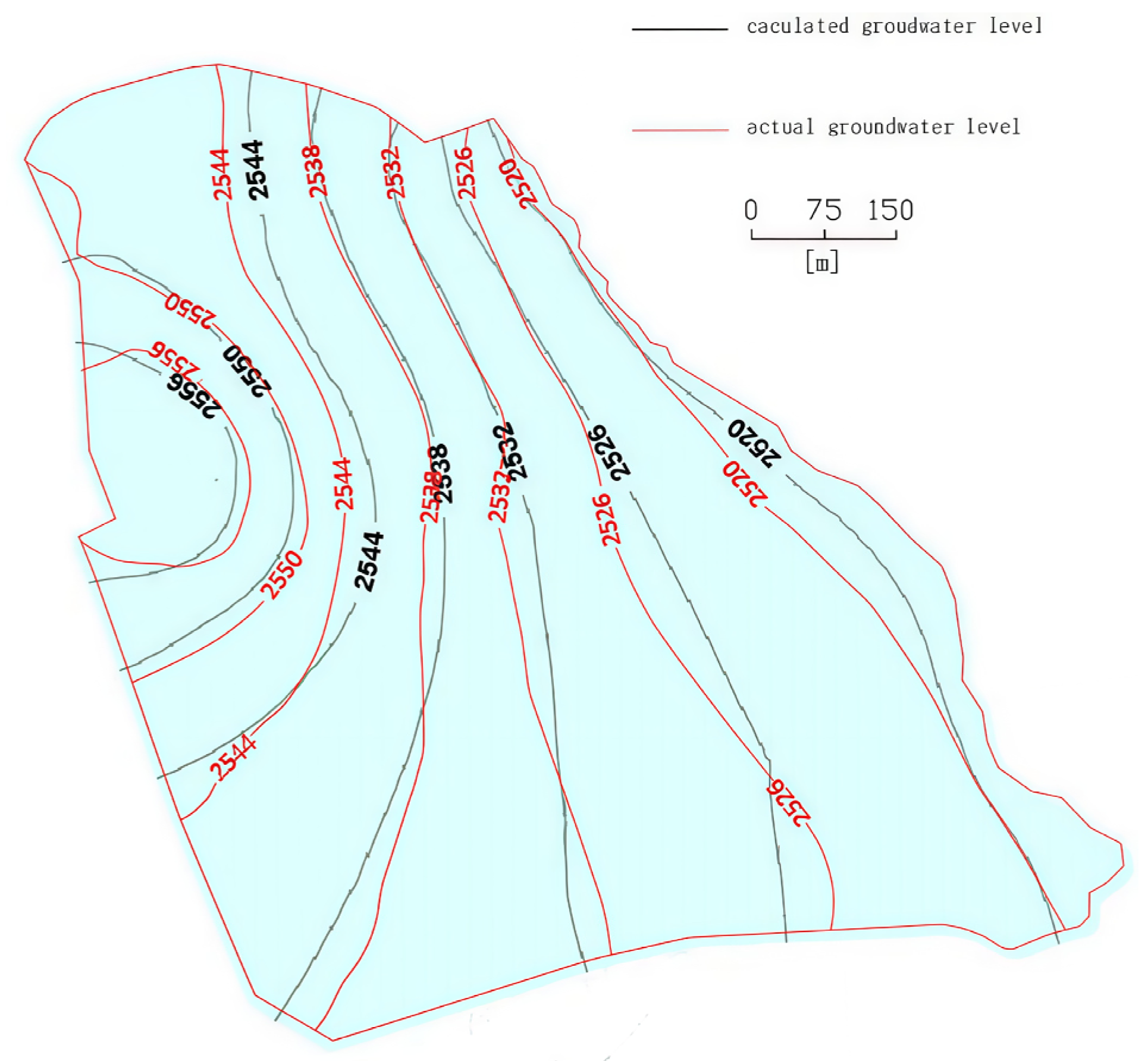 The model parameter verification uses the trial-and-error method. The initial flow field is input into the model with the initial values of parameters obtained from the hydrogeological survey of the study area, and the natural initial flow is obtained through stable flow calculation. Then, the parameters are corrected based on the measured water level, and the corrected initial flow field is obtained (