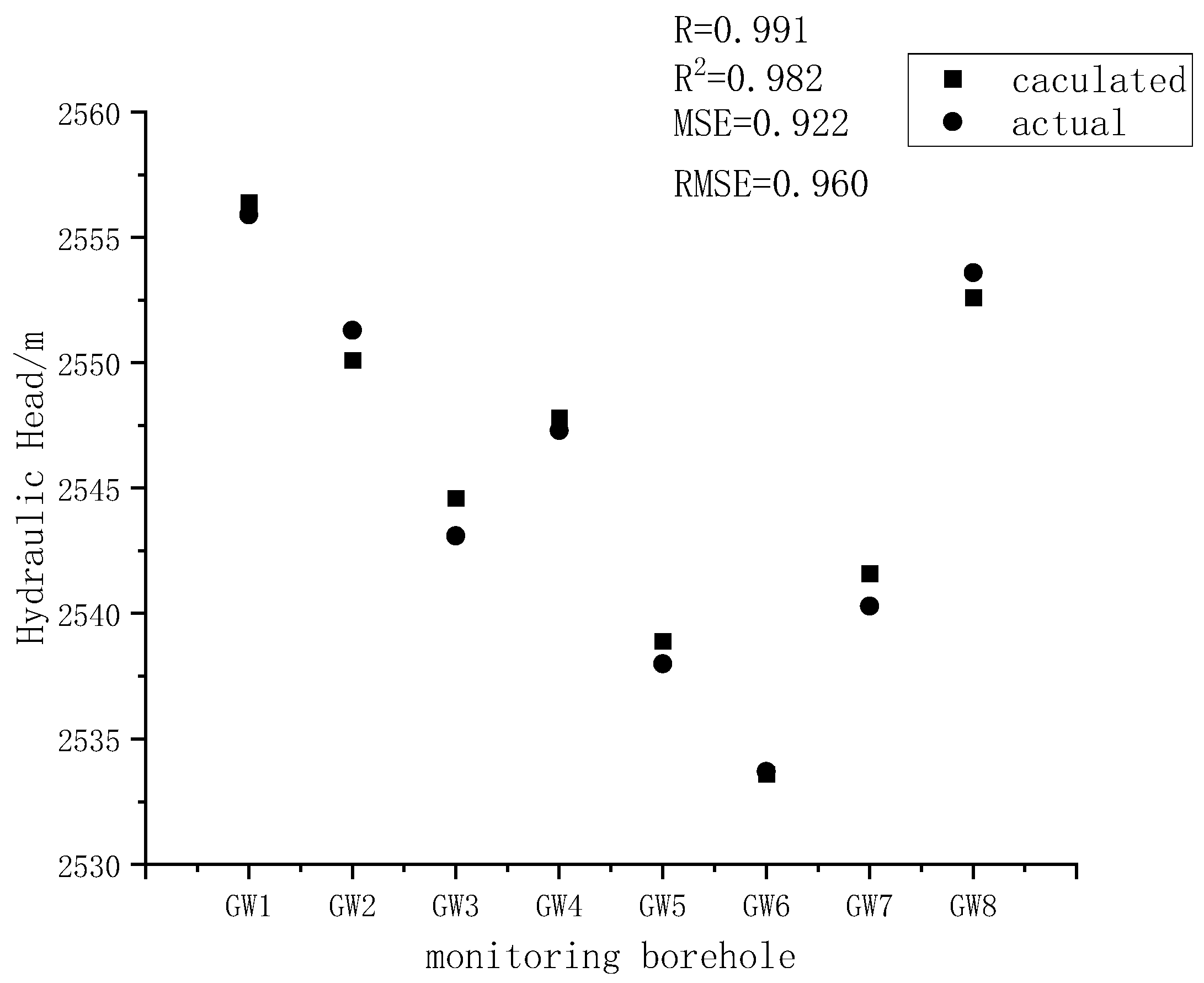 Figure 6) yielded a correlation coefficient of 0.991. The mean squared error (MSE) was 0.922, and the root mean squared error (RMSE) was 0.960 when comparing the simulated values to the actual measurements. These results indicate that the initial flow field of the model essentially aligns with the actual hydrogeological conditions of the study area and reflects the characteristics of the real flow field. Therefore, the flow field obtained from this model can be reliably used as the initial condition for transient flow simulations and serves as the basis for subsequent solute transport modeling.