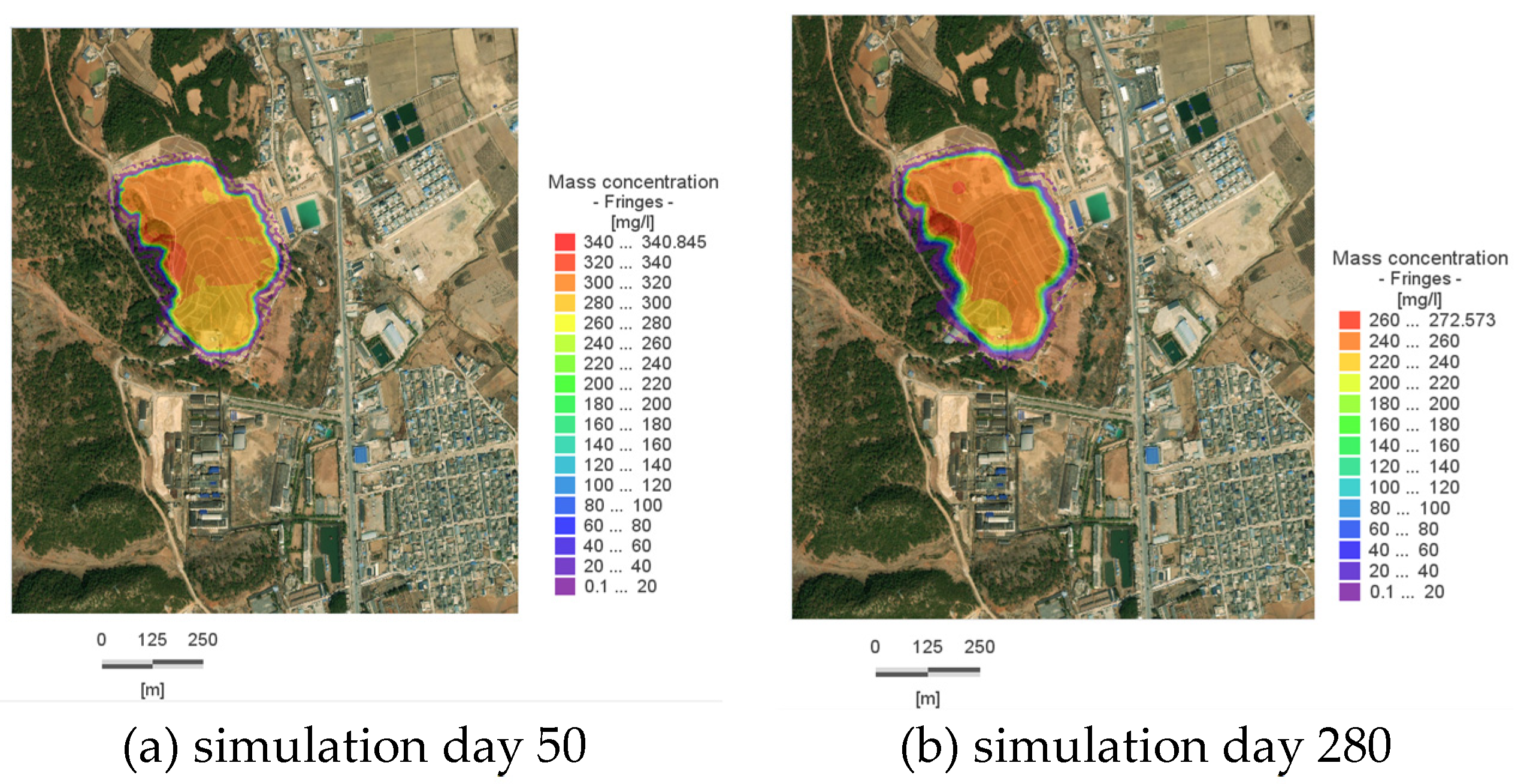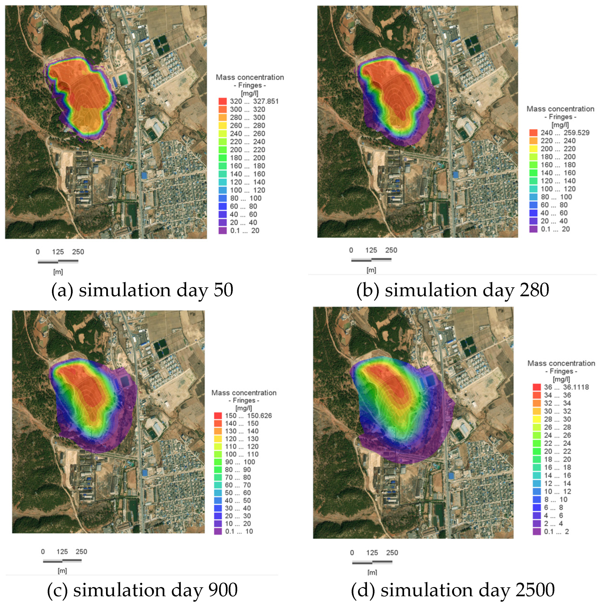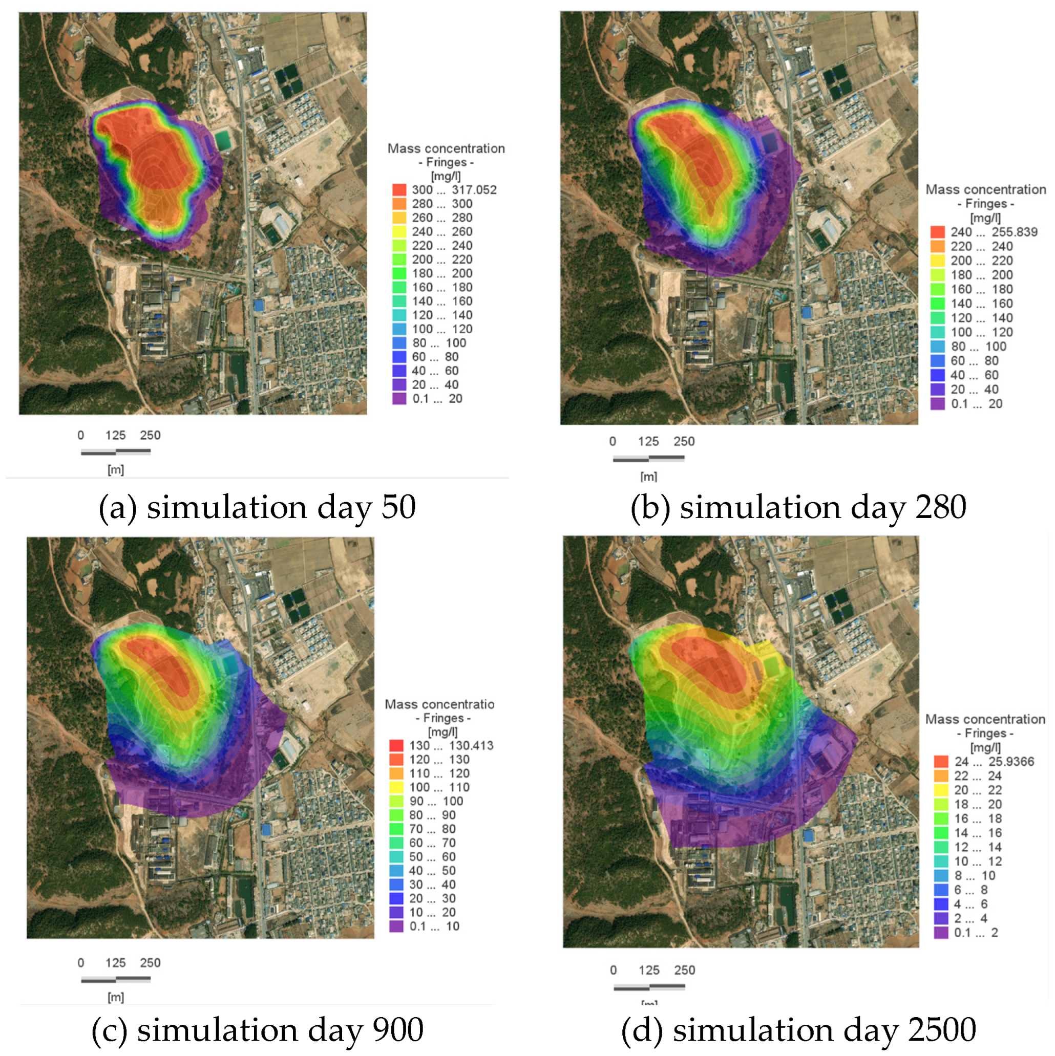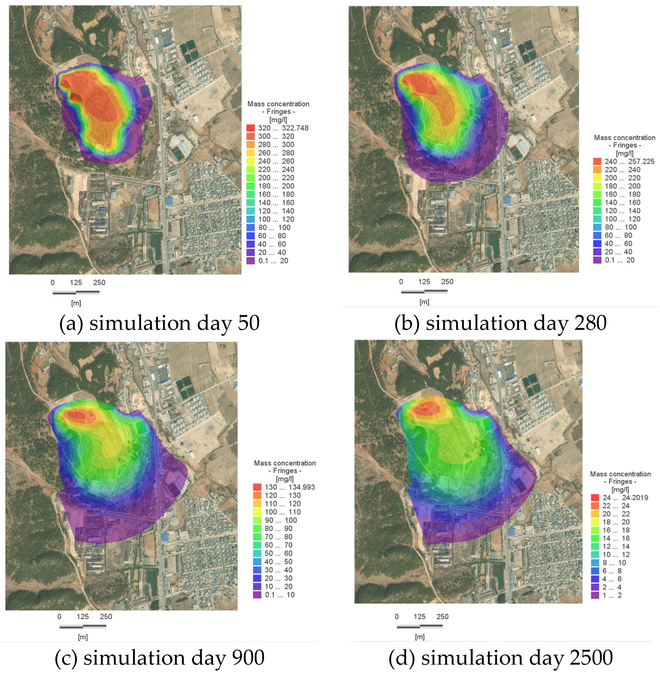 Figure 8a), with a concentration of 322.68 mg/L at the center of the pollution plume; by Day 280, the plume reaches the western boundary, with a concentration of 257.23 mg/L at its center; by Day 900, the reach of the plume near the Slope Toe River stabilizes, with a concentration of 135 mg/L at its center; by Day 2500, the concentration at the center of the plume within the site is 24 mg/L, indicating that the plume’s spread has essentially ceased, and there has been a significant reduction in the overall amount of pollutants within the site.