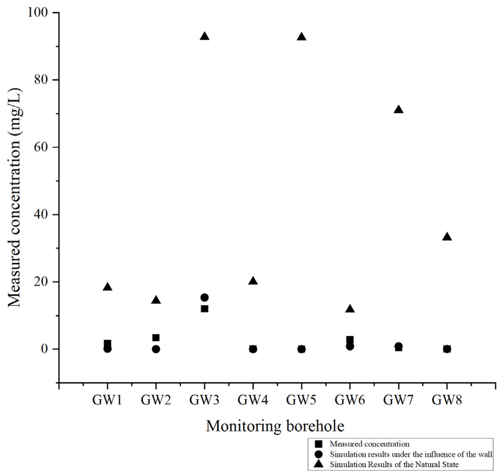 Figure 3 were examined. These samples compared the zinc ion concentrations in each borehole under natural conditions, cutoff wall construction, and those actually measured. The findings are presented in