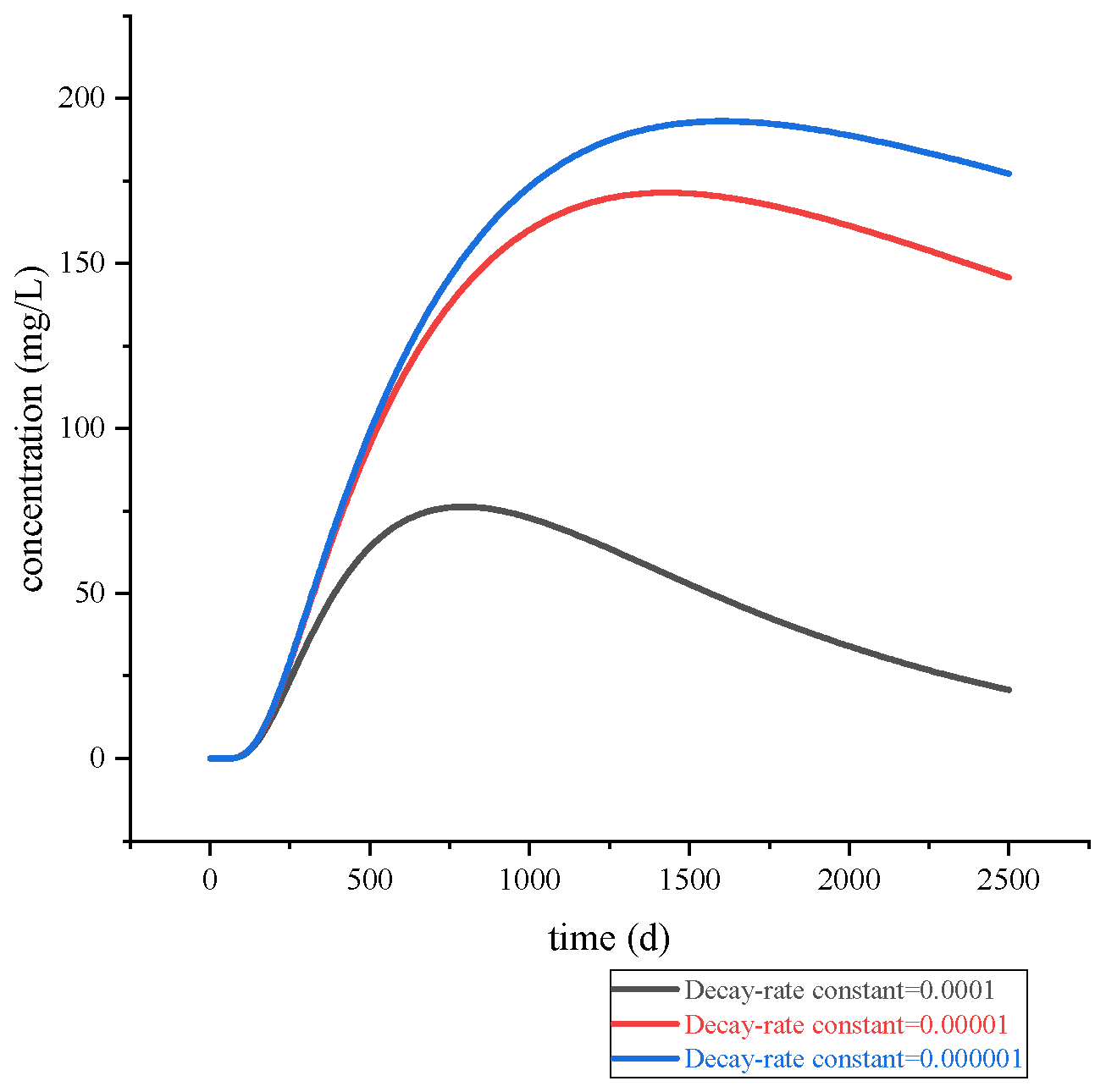 From the perspective of decay time, with a decay rate of 0.0001, the contaminant concentration at the riverside monitoring point shows a significant decrease by day 2500 compared to its peak. In contrast, a lower-order decay rate results in a smaller reduction. This indicates that the decay reaction has a notable effect on reducing zinc ion concentration. Therefore, it is feasible to confine the contamination within a limited area and appropriately adjust the groundwater pH within that zone to influence the reaction rate, thereby further reducing zinc ion levels. However, it is crucial to ensure that this process does not introduce new sources of pollution and cause secondary contamination.