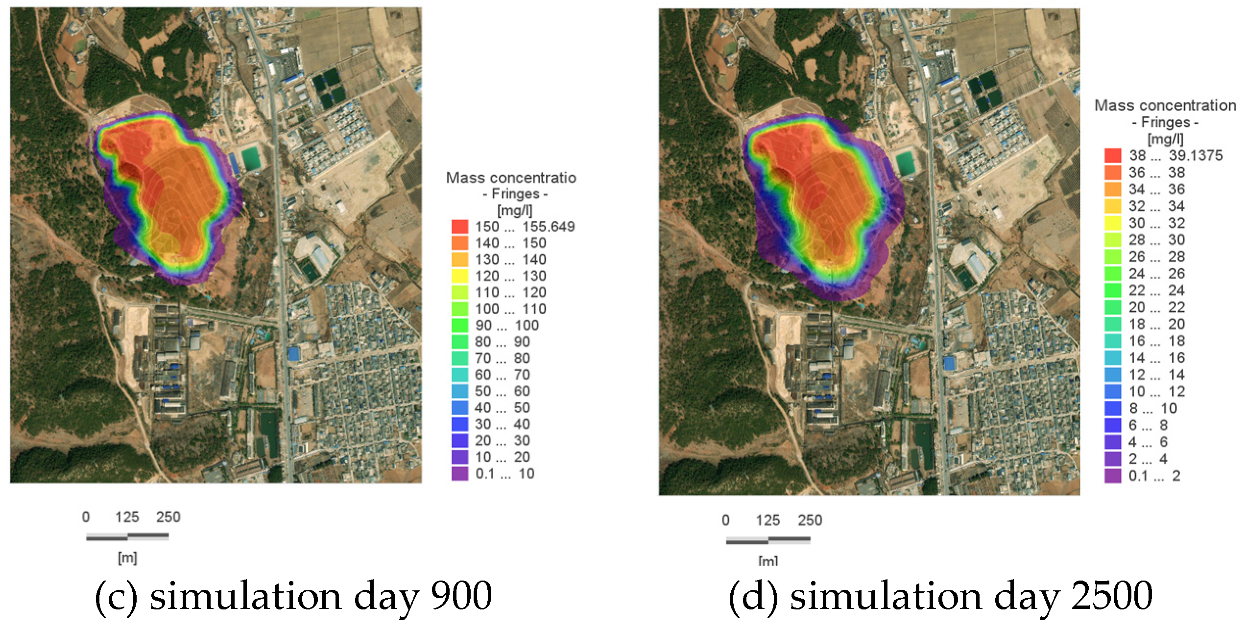 Figure 9a), the maximum dispersion distance without the cutoff walls had reached 95.8 m; after their construction, it was reduced to 15.6 m. By the 2500th day of the simulation, the maximum dispersion distance without the cutoff walls had increased to approximately 220 m; after their construction, it decreased to 77 m, representing a significant reduction (