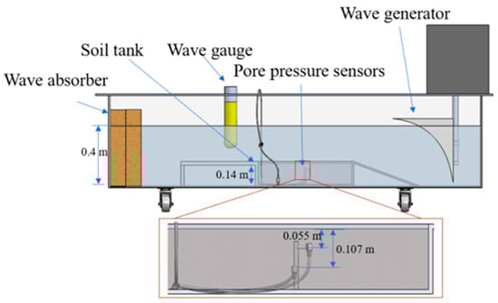 The soil tank was located 0.6 m away from the wave generation device, with a length of 0.6 m and a height of 0.16 m. It featured a detachable design; thus, the seabed could be prepared outside and then placed into the water flume. Two pore pressure sensors were vertically placed at the center of the soil tank, at 5.5 cm and 10.7 cm depth from the seabed surface, respectively, to measure the EPP response at different depths. To prevent sudden changes in wave shape, a slope was set up between the wave generator and the soil tank. A wave gauge was installed on the left side of the tank to measure the wave conditions during the experiment.