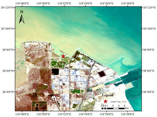 The experimental soil was taken from the Chengdao area in the northern part of the Yellow River Delta, as marked by the red star in Figure 2. The reason for selecting this sampling location is that, through field experiments, it was found that the soil in this area is highly susceptible to liquefaction under cyclic vibration loads. To analyze the physical and mechanical properties of the liquefiable soil, we collected cylindrical samples with a length of 25 cm from three sites in this area. The cylindrical samples were divided into layers every 5 cm, and tests for water content and particle size analysis were conducted. Particle size analysis was performed using a laser particle size analyzer. The experimental results are shown in Figure 3. The water content of the soil layers was in the range of 21–28%. The clay content was 6–19%, the silt content was 69–86%, the sand content was 2–22%, and the median grain size was 0.03 mm.