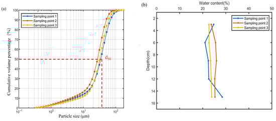 (a) Particle size distribution curve of the experimental soil; (b) water content of cylindrical samples along the depth.