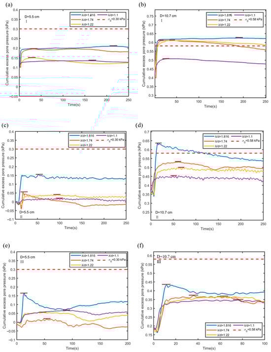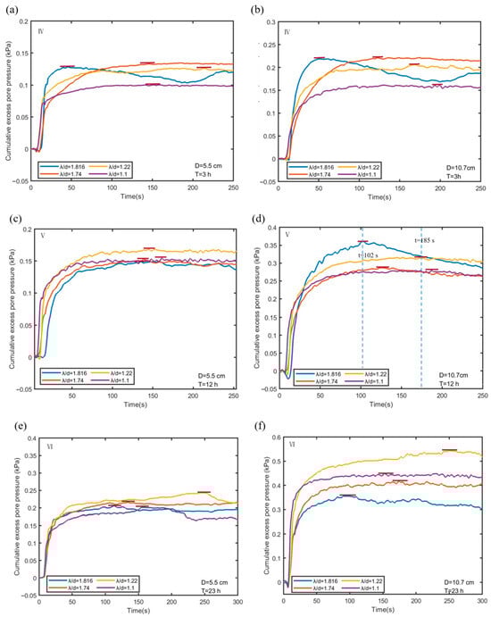 Time series of cumulative EPP at different depths of non-liquefied soil under different relative wavelengths in rounds IV, V, and VI of the experiments. (a,c,e) represent the cumulative EPP at D = 5.5 cm in rounds IV, V, and VI of the experiments. (b,d,f) represent the cumulative EPP at D = 10.7 cm in rounds IV, V, and VI of the experiments. Note: the blue line corresponds to the relative wavelength (λ/d) = 1.816, the red line (λ/d) = 1.74, the yellow line (λ/d) = 1.22, and the purple line (λ/d) = 1.11. D represent the depth of the soil, and T is the consolidation time. The short, horizontal, dark red line represents the cumulative magnitude value of EPP.