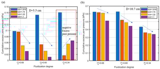 When the initial liquefaction degree is = 0.68 (Round I), under a wave action of λ/d = 1.816, 1.74, and 1.22 (Figure 4b), as well as when the initial liquefaction degree is = 0.60 (Round II), under a wave action of λ/d = 1.816 (Figure 4d), the cumulative EPP at 10.7 cm is greater than the initial effective stress of the seabed (Figure 4b,d). Therefore, at this time, the soil at the depth of the seabed is in a state of complete liquefaction. However, the EPP at D = 5.5 cm in the seabed is far from reaching the initial effective stress of the soil. The EPP in the deeper region of the seabed is relatively high before wave loading. This is because, during the natural sedimentation and consolidation process, the water content of the sediment is higher in the deeper regions of the seabed, which is consistent with the water content measurements obtained from the cylindrical samples collected in the Yellow River Delta. Under wave action, the difference in soil permeability leads to easier accumulation of pore water pressure at a certain depth within the seabed. In contrast, the pore water pressure in the shallow sediment is less likely to accumulate due to the relatively loose soil structure, and it dissipates more quickly.