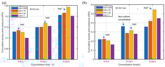 As shown in Table 4, when the consolidation time is 3 h, the cumulative magnitude of EPP reaches a maximum of 0.1346 kPa at D = 5.5 cm and a maximum of 0.2209 kPa at D = 10.7 cm under a wave action of λ/d = 1.74, indicating that the maximum response wavelength is λ/d = 1.74.