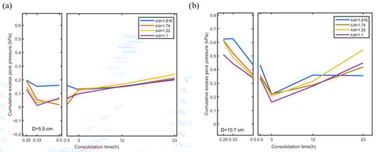 As can be seen from Figure 8, when the consolidation time is 3 h (round IV), the cumulative magnitude of EPP is largest under λ/d = 1.74 at both depths (this can also be found in Figure 7a,b).