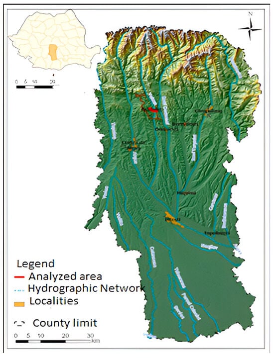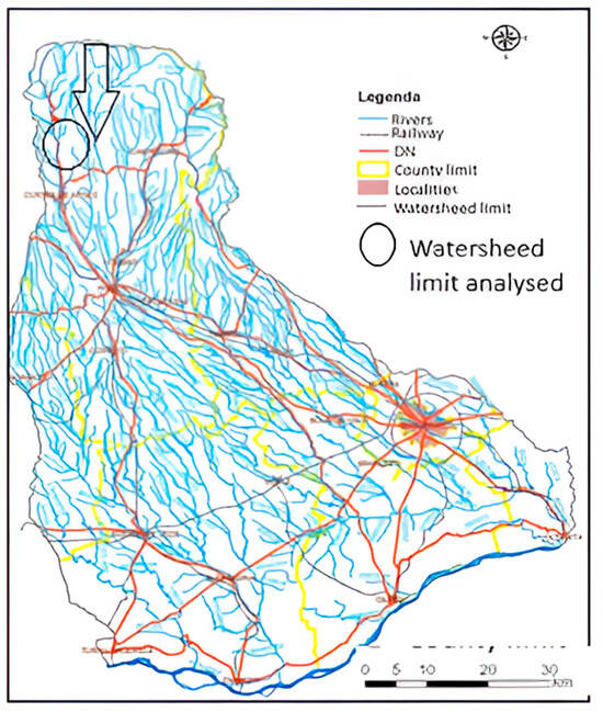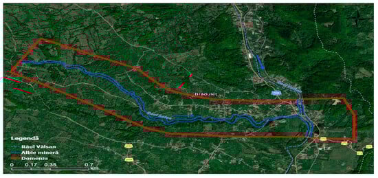 The study area, delineated using topographic maps and high-resolution orthophotographs, comprises an estimated surface of 7.5 km2. The modelled domain includes various hydrological and anthropogenic features—namely the minor bed of the Șolea stream, a segment of the Vâlsan River, infrastructural elements (roads, culverts, and bridges).