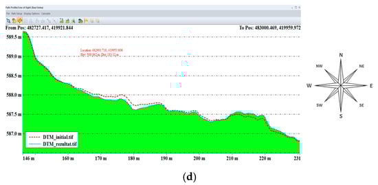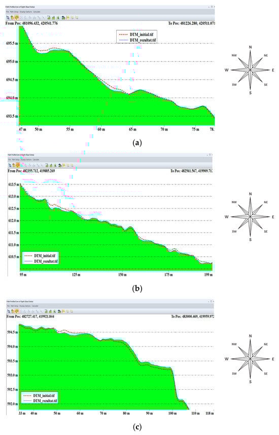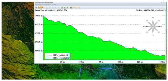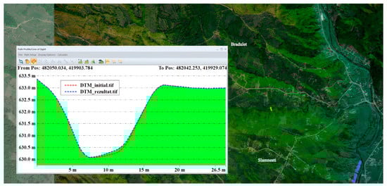 For the construction of the numerical model, the topographic data were processed using the Stereo 70 coordinate system, with S-42 Romania as the geodetic datum. The core dataset consisted of a high-resolution Digital Terrain Model (DTM) with a spatial granularity of 1 × 1 m, compiled from field surveys and elevation measurements conducted under the auspices of the R.W.N.A (Romanian Waters National Administration) in 2020 as part of national hydrographic mapping initiatives.