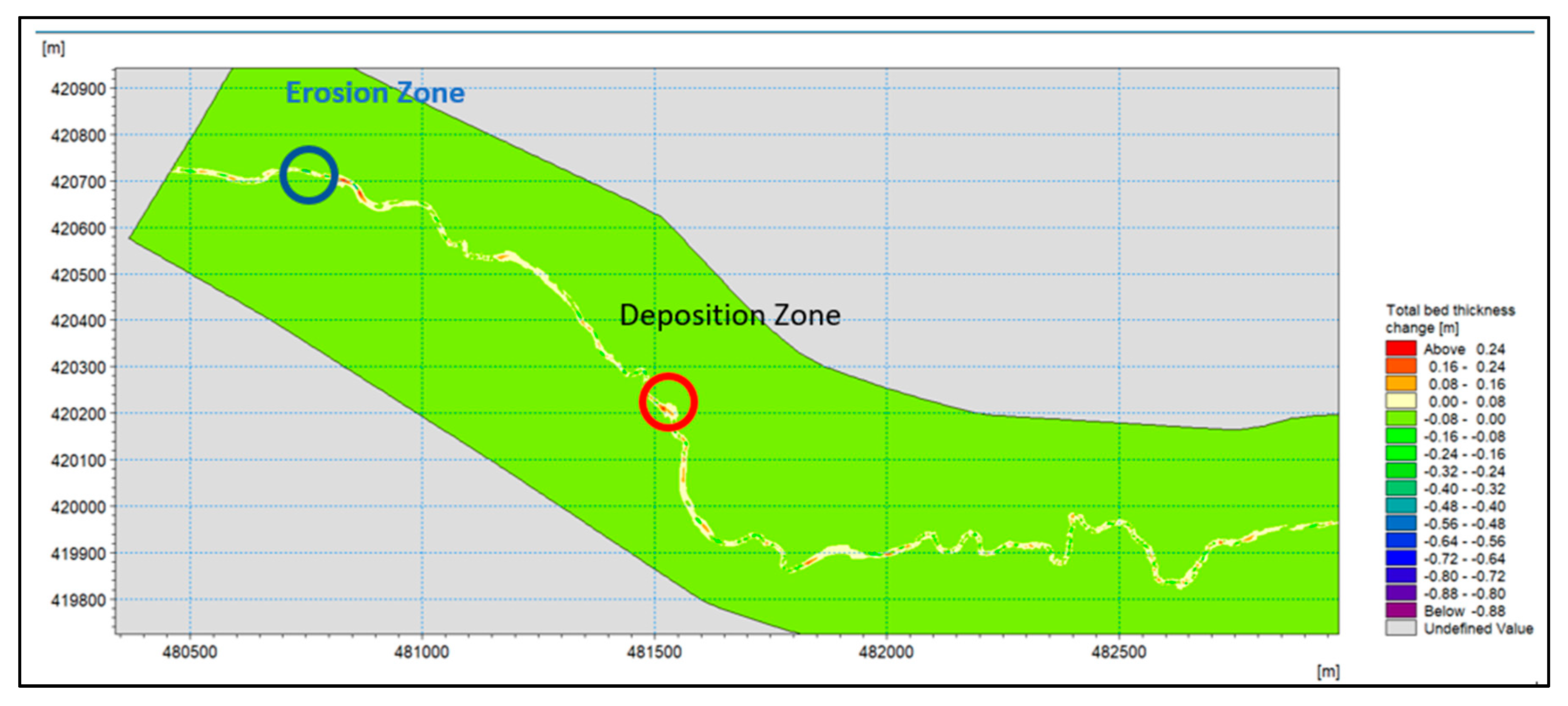 - Bed Roughness: Bed roughness modulates flow velocity gradients at the sediment-water interface. It influences turbulence levels, shear stress, and ultimately the initiation of sediment motion. The roughness coefficient was determined according to particle size, bedform geometry, and material cohesion, calibrated in alignment with MIKE software guidelines and field observations.
