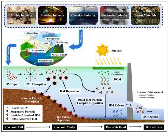 Under the influence of high dams, the reduced flow velocity in reservoirs decreases the river’s sediment transport capacity, thereby increasing sediment retention time and promoting the settlement of sediment particles [32,94]. Coarse sediment particles typically settle at the reservoir tail, forming sedimentary deltas, while finer particles are carried toward the reservoir center, and the smallest particles and colloids eventually reach the reservoir head through density flows [94]. Thus, the distribution of suspended sediments in the reservoir separates according to particle size and density, with the smallest particles at the reservoir head, which facilitates the adsorption and settling of heavy metal pollutants (Figure 2) [96,120].