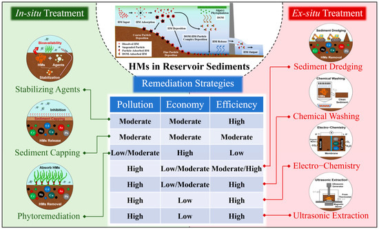In situ and ex situ remediation techniques for treating heavy metals (HM)-contaminated reservoir sediments and a comparison in terms of applicable HM pollution severity, economy, and efficiency.