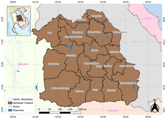 25]. The Mekong flows along the northern and eastern borders, while the Chi and Mun rivers are major tributaries feeding the Mekong. The Mun River traverses the southern provinces, including Surin and Si Sa Ket, which are the focal areas of this study. Agriculture—primarily rainfed rice cultivation—remains the dominant livelihood, making the region highly sensitive to rainfall variability [