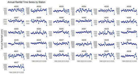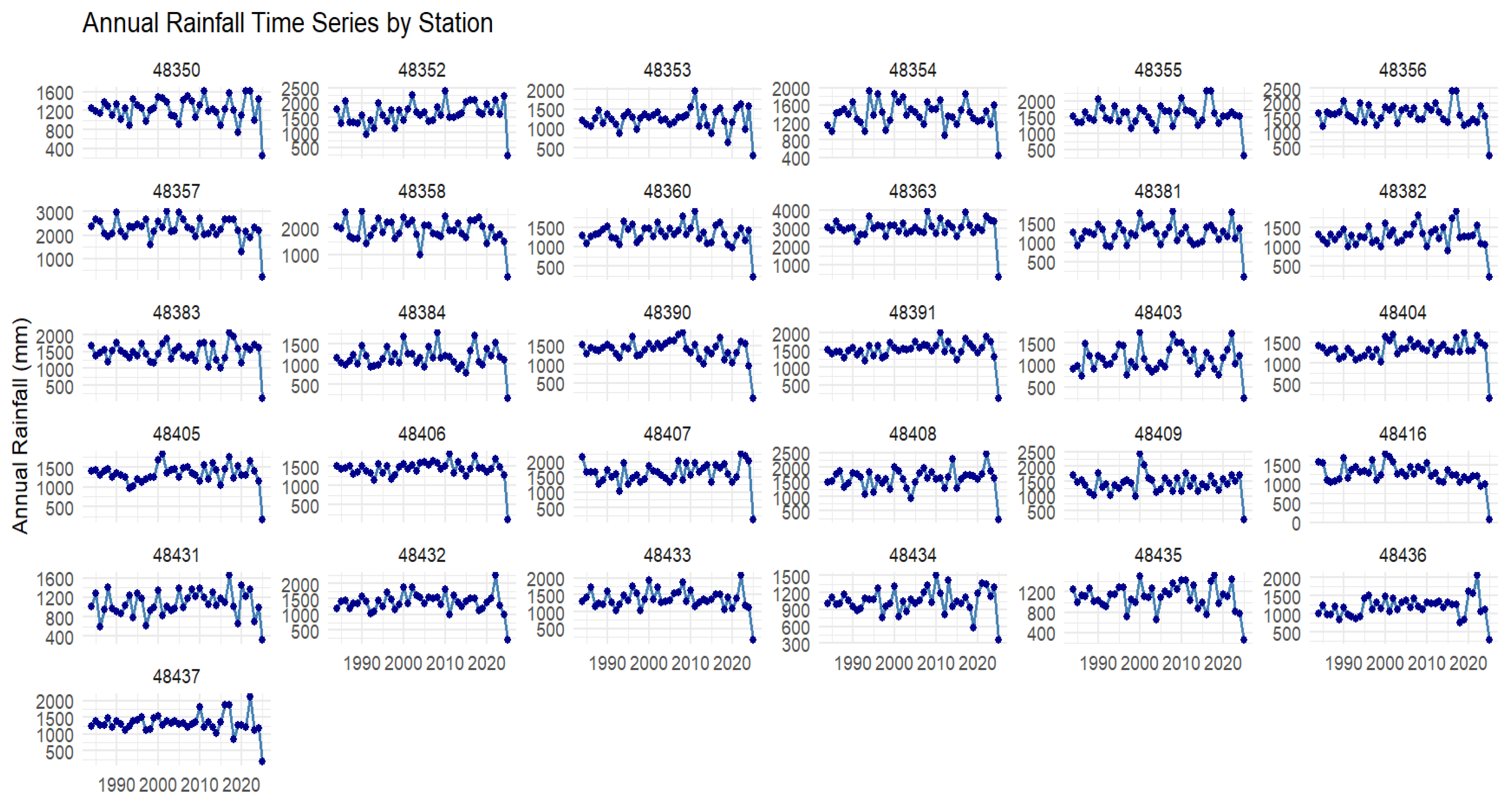 Table 1) for the period of 2007–2025. The dataset comprised monthly precipitation and temperature records, which were aggregated to annual rainfall to visualize rainfall variability for the period of 1984–2025 (