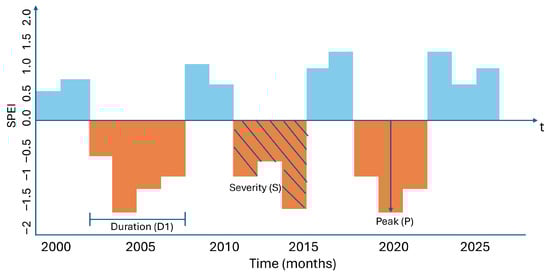 30], applied to the SPEI time series. A drought event was defined as a continuous period of months with SPEI values below 0, representing water deficit conditions. The drought characteristics of interest—duration (