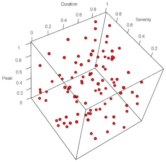 35]. Archimedean copulas are well-suited for asymmetric tail dependence commonly observed in hydrological extremes, while Elliptical copulas capture symmetric dependencies. Each copula was fitted individually to every station and drought characteristic series.