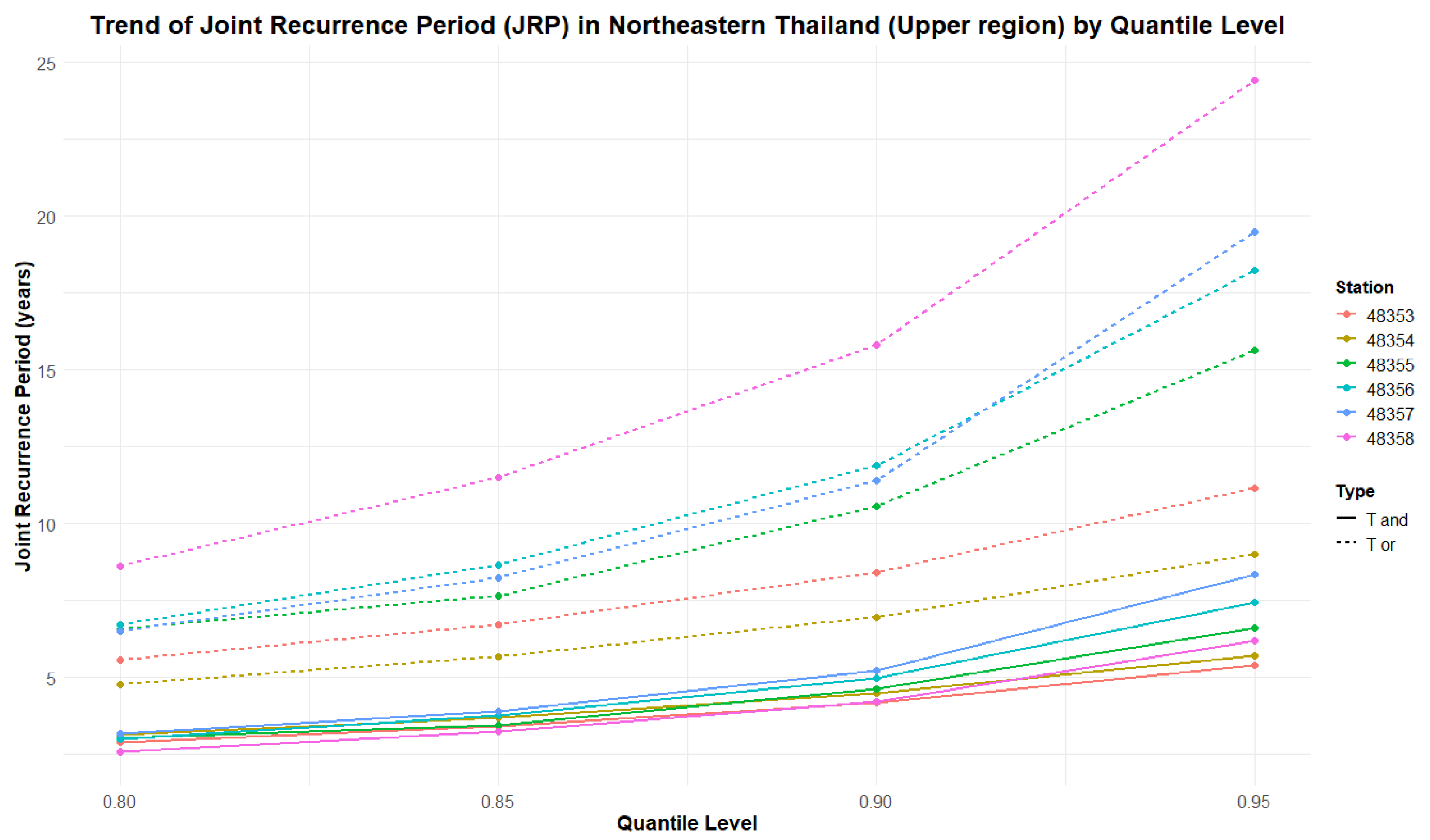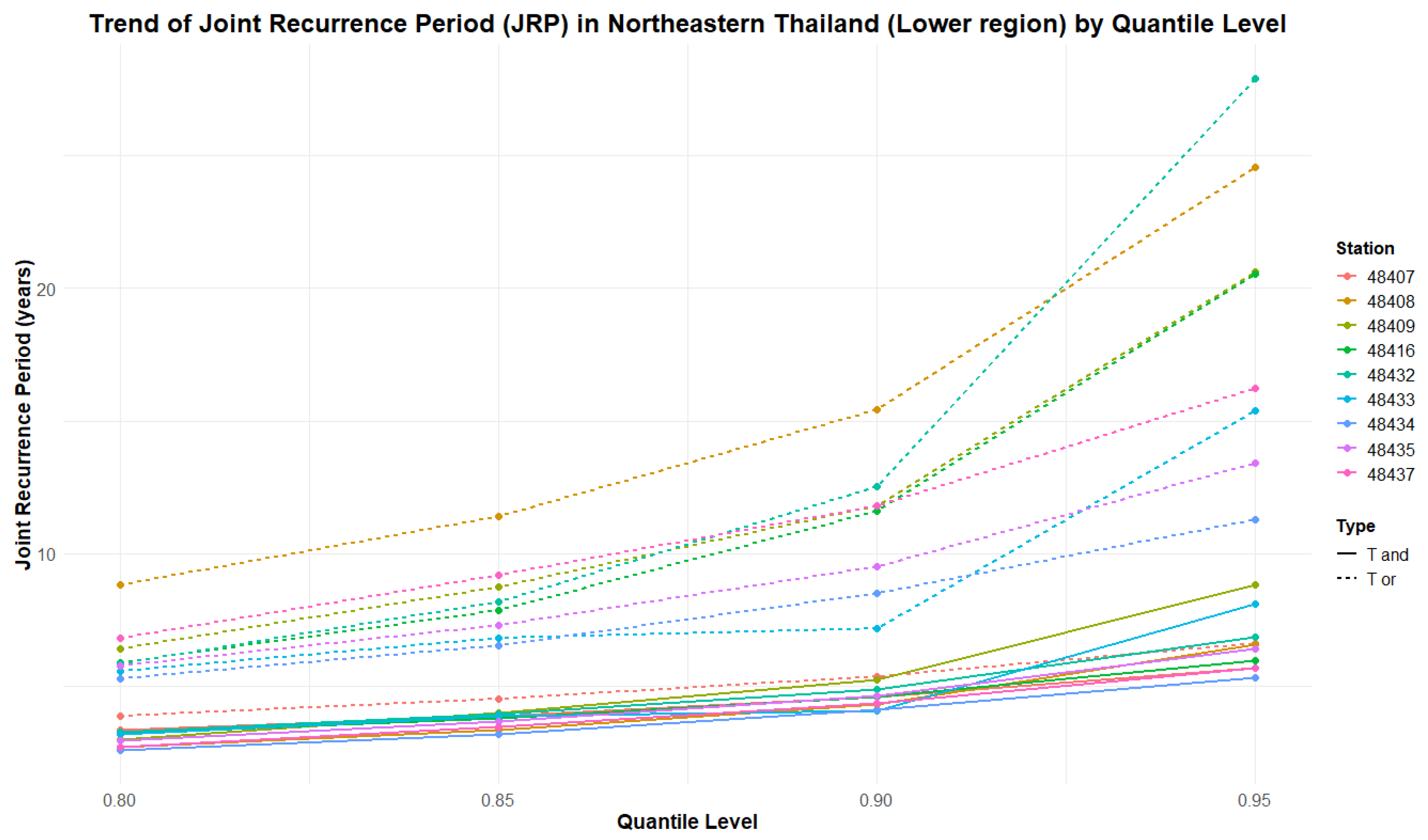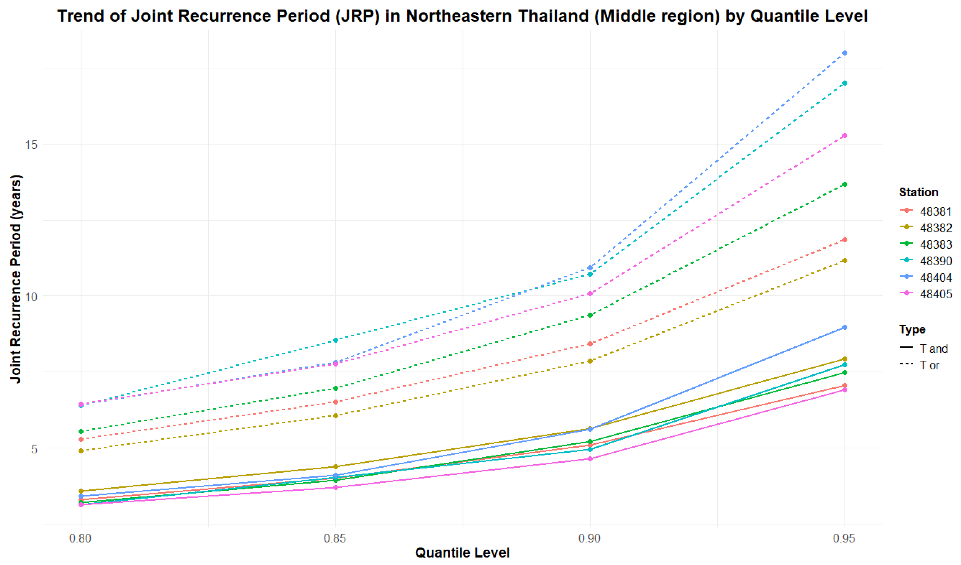 In such contexts, the application of trivariate copula models offers a more robust and flexible analytical framework. Unlike bivariate models, trivariate copulas can represent the joint behavior of three variables simultaneously, providing a more comprehensive understanding of drought dynamics. This is particularly advantageous when analyzing key characteristics of drought, such as duration, severity, and peak, together rather than in isolation or in pairs. Modeling these characteristics jointly enables a more accurate estimation of joint return periods and the probability of concurrent extreme events, which are crucial for practical drought risk assessment and resource planning. Moreover, trivariate copulas help capture complex tail dependencies and non-linear interactions that simpler models often miss. By accounting for higher dimensional dependence structures, they improve the reliability of drought characterization and enhance the predictive capabilities of early warning systems. This makes them a valuable tool in regions facing increasing climate variability, such as Thailand, where decision-makers require more precise and integrated information to support water management, agriculture, and disaster preparedness [