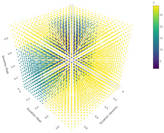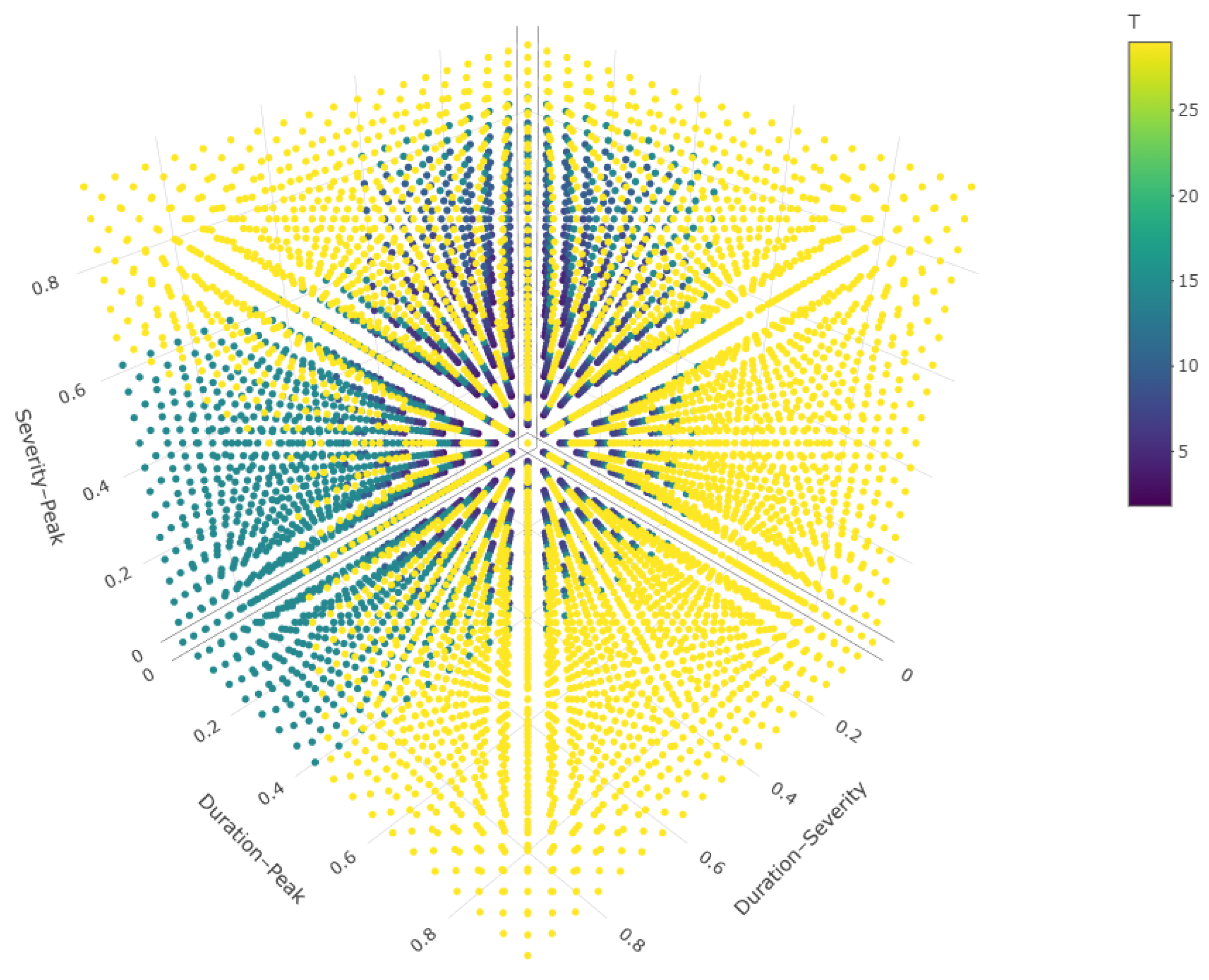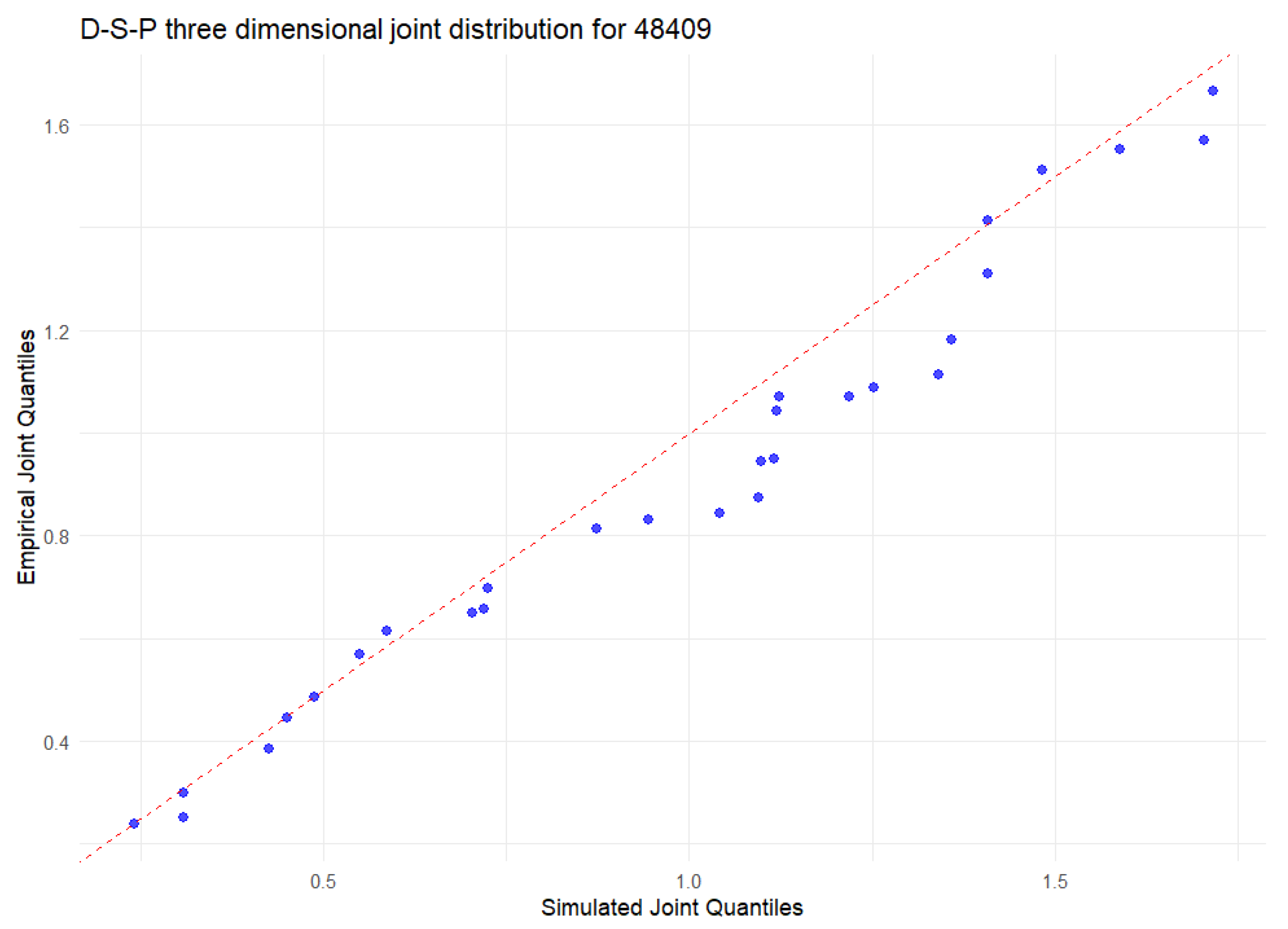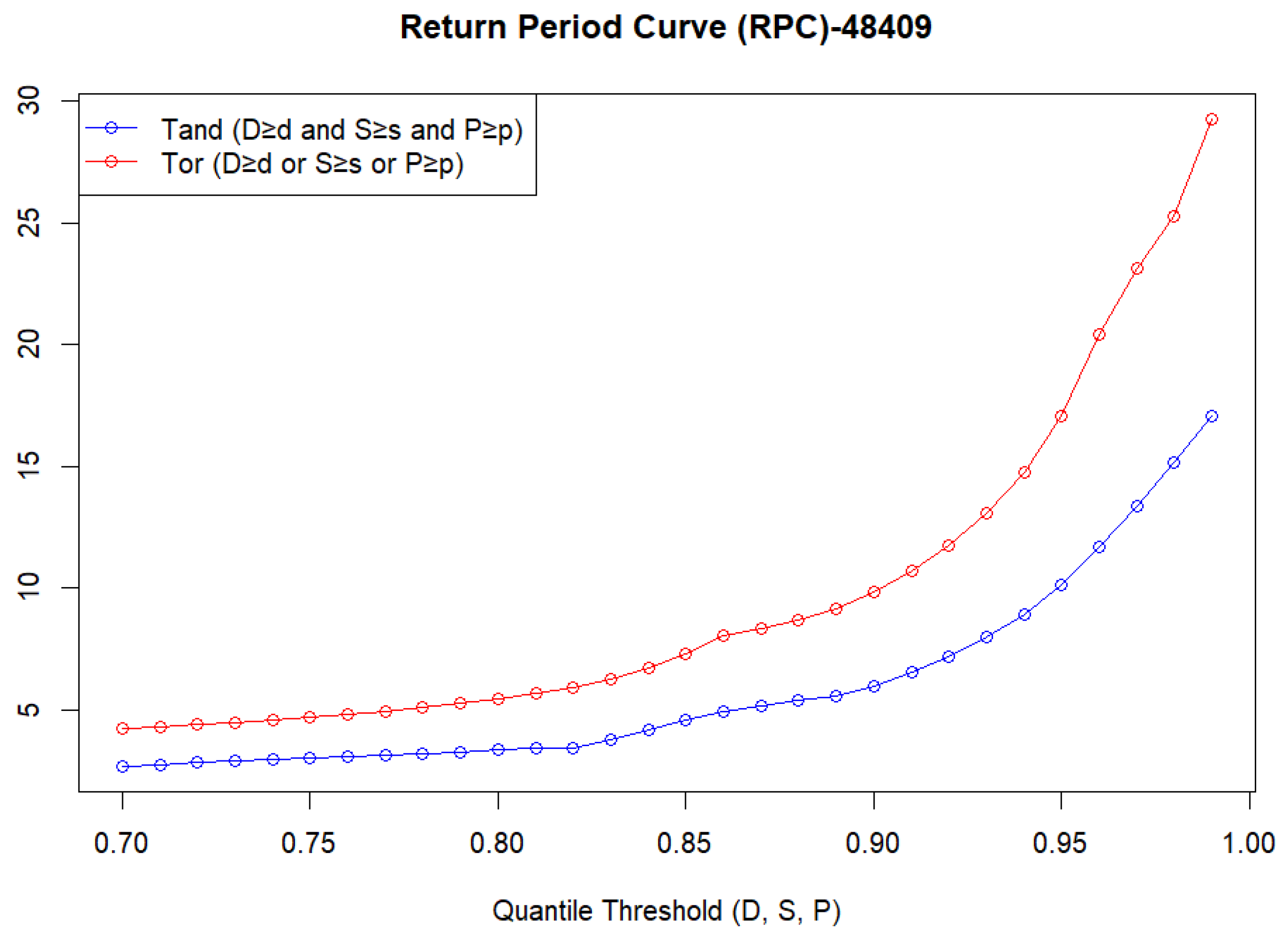 In such contexts, the application of trivariate copula models offers a more robust and flexible analytical framework. Unlike bivariate models, trivariate copulas can represent the joint behavior of three variables simultaneously, providing a more comprehensive understanding of drought dynamics. This is particularly advantageous when analyzing key characteristics of drought, such as duration, severity, and peak, together rather than in isolation or in pairs. Modeling these characteristics jointly enables a more accurate estimation of joint return periods and the probability of concurrent extreme events, which are crucial for practical drought risk assessment and resource planning. Moreover, trivariate copulas help capture complex tail dependencies and non-linear interactions that simpler models often miss. By accounting for higher dimensional dependence structures, they improve the reliability of drought characterization and enhance the predictive capabilities of early warning systems. This makes them a valuable tool in regions facing increasing climate variability, such as Thailand, where decision-makers require more precise and integrated information to support water management, agriculture, and disaster preparedness [