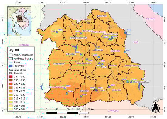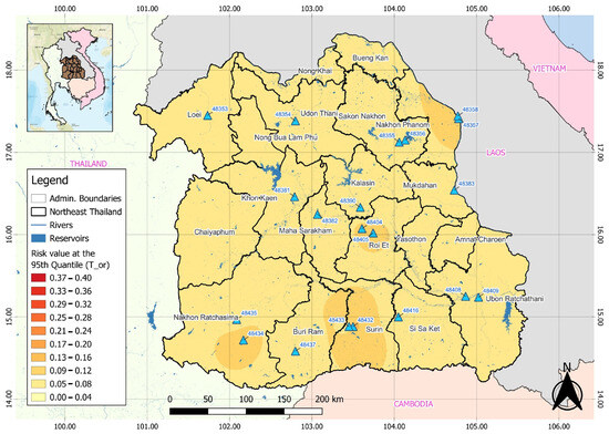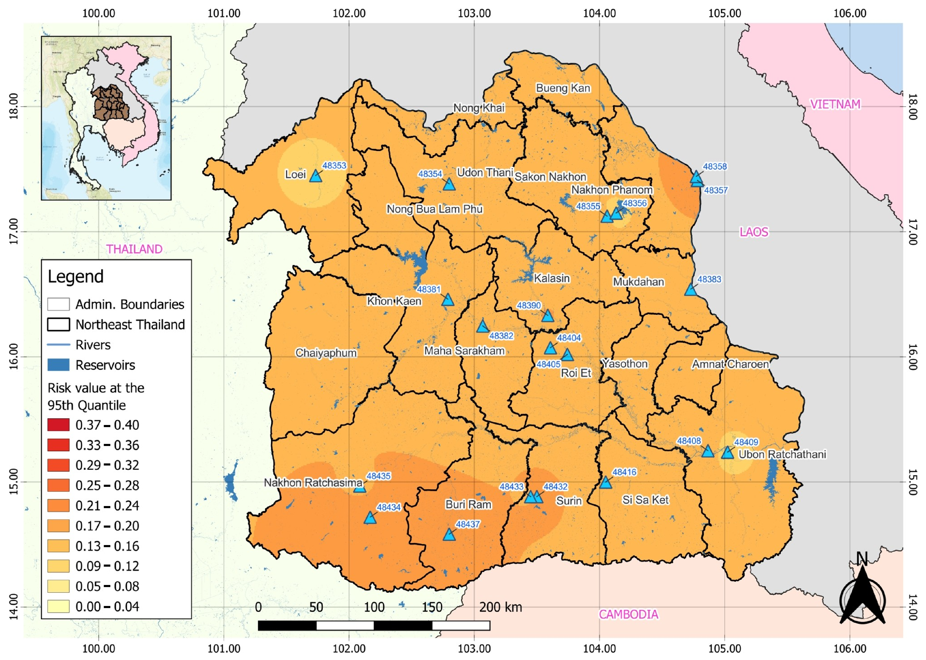 This study primarily aims to conduct a risk analysis of compound drought events in Northeastern Thailand by integrating the SPEI with other key drought characteristics—namely, duration, severity, and peak intensity—through a trivariate copula framework. By capturing the inter-relationships among multiple drought indicators, this approach aims to enhance the precision of drought assessment, provide deeper insights into drought risk, and inform adaptive strategies for water resource management and agricultural resilience in an increasingly variable climate.
