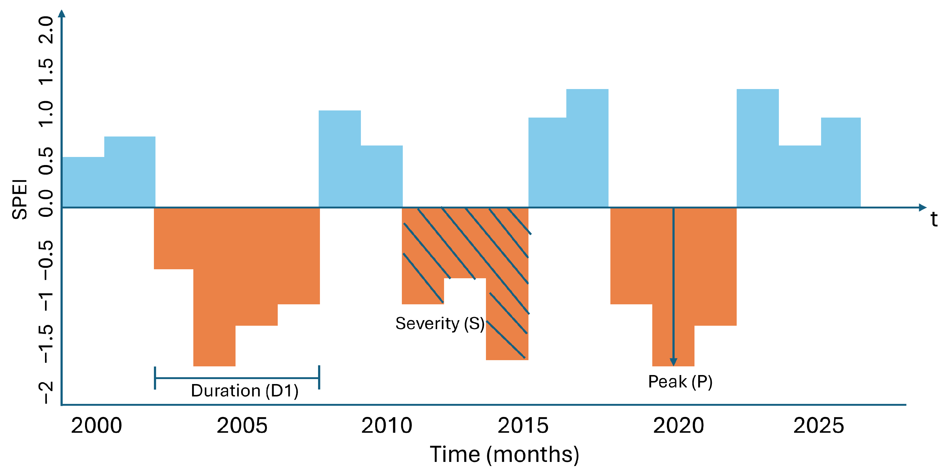 Severity (S): the cumulative SPEI deficit over the event, i.e., the sum of negative SPEI values;
