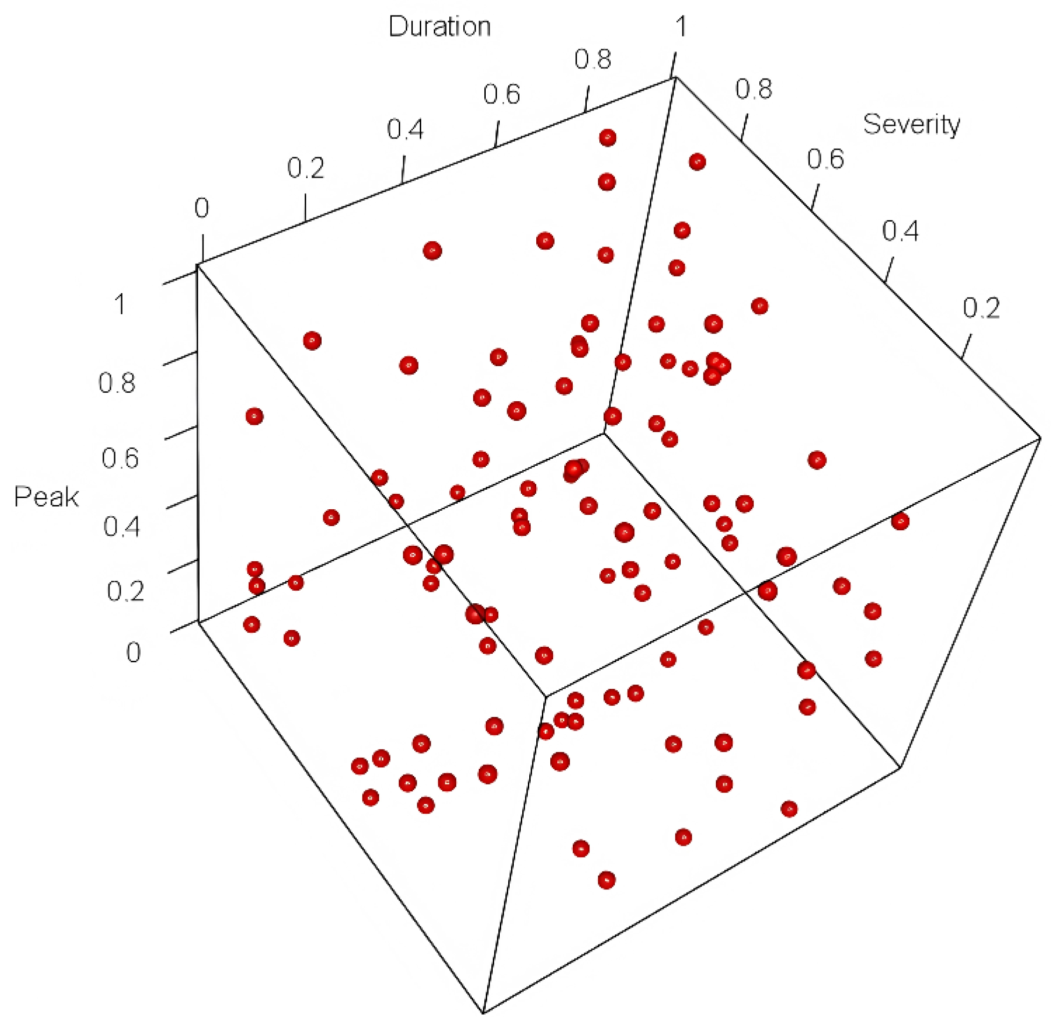 between drought periods were treated as separate events. Sensitivity tests confirmed that this approach did not significantly affect the estimated joint probabilities of drought characteristics.