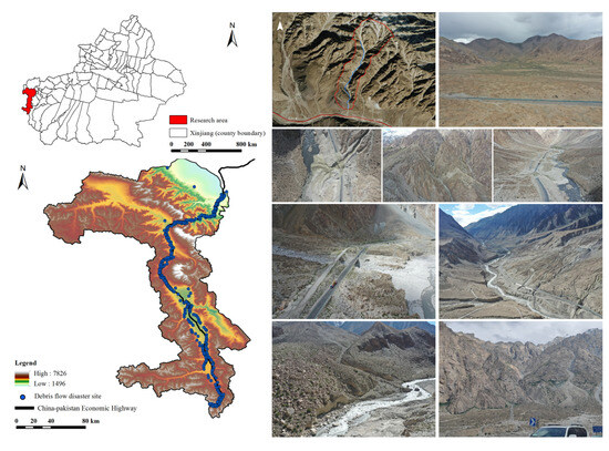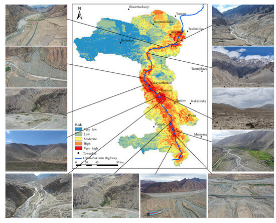 Worldwide, mountainous geological hazards are one of the most common natural disasters [1], and debris flows are among the most widespread and destructive geological hazards in mountainous regions [2]. In recent years, the increased frequency of earthquakes and extreme weather events has significantly raised the occurrence and scale of debris flow activity [3]. Meanwhile, with the continuous development of socioeconomics and the expansion of human activities in mountainous areas, infrastructure construction has accelerated, further exacerbating the adverse impacts of debris flows. These disasters pose serious threats to human safety and property. The China–Pakistan Economic Corridor is one of the six major economic corridors identified as part of China’s Belt and Road Initiative. It connects the “Maritime Silk Road” in the south with the “Silk Road Economic Belt” in the north, making it a pioneer zone for the Belt and Road development. It is a critical economic route that encompasses transportation, energy, communications, agriculture, and hydropower, holding significant strategic importance [4]. The China–Pakistan Economic Corridor is located in the southwest of Xinjiang, eastern Pamir Plateau, and western section of the Kunlun Mountains, where the geological environment is highly complex and variable. Under the influence of a warming and humidifying climate, debris flow disasters in this area have become more frequent, expanding the disaster risk, severely threatening road transportation, and posing a significant challenge to the sustainable socioeconomic development [5,6,7]. Therefore, conducting research on regional debris flow risk has great significance for disaster mitigation and risk control in the area.