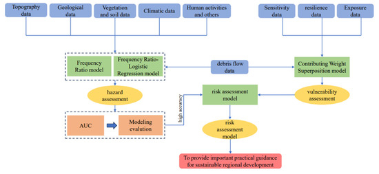 This study selects 12 hazard assessment indicators from five aspects—topography and geomorphology, geological structure, vegetation and soil, climatic, and human activities—to establish a hazard assessment system. The frequency ratio model and the frequency ratio–logistic regression coupled model are used to evaluate the debris flow hazard in the study area, and the models are evaluated using the AUC value of the ROC curve to determine the optimal model. For vulnerability, six assessment indicators are selected from the aspects of exposure, sensitivity, and resilience to establish a vulnerability assessment system. The Contributing Weight Superposition model is applied to evaluate the debris flow vulnerability in the study area. Based on the hazard and vulnerability assessment results, a risk assessment model is used to obtain the debris flow risk assessment results for the study area. The specific process is shown in Figure 2.