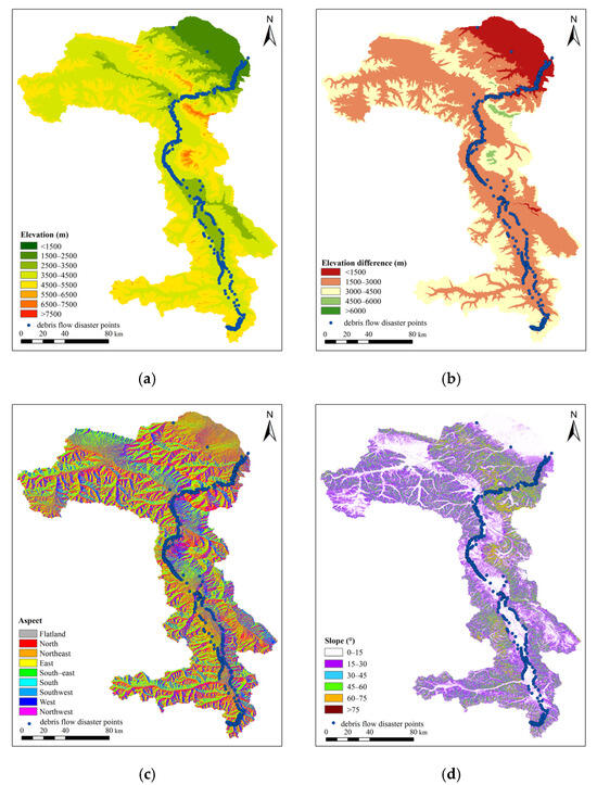 The topographic and geomorphological data mainly include elevation, relative elevation difference, slope, and slope direction, among which the elevation directly reflects variations in topographic undulation, gullies, vegetation types, soil types, and precipitation in the study area. Therefore, elevation has a significant impact on debris flow. In this study, the elevation of the study area is classified into eight classes: 0–1500 m, 1500–2500 m, 2500–3500 m, 3500–4500 m, 4500–5500 m, 5500–6500 m, 6500–7500 m, >7500 m, as shown in Figure 3a.