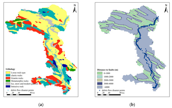 Distribution of geological factors. (a): lithology, (b) distance to faults.