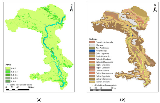 Distribution of vegetation and soil factors. (a) NDVI, (b) soil type.