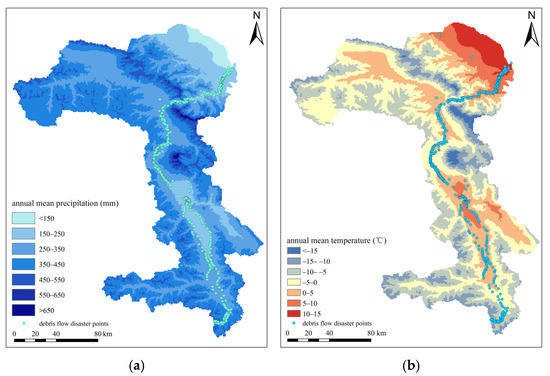 The China–Pakistan Economic Corridor is located in mountainous areas with a complex geological environment, and glaciers are present in the valleys. In summer, the high temperatures in the study area accelerate glacier melting, generating substantial meltwater that may trigger glacial meltwater debris flow disasters. For instance, at 15:00 on 22 July 2021, during a debris flow survey in Bulunkou Township, Akto County, scientific investigators observed a debris flow event triggered by glacial meltwater. Therefore, temperature is another important factor influencing debris flow disasters in the study area. This study selected the annual mean temperature from 1960 to 2020 to reflect the climate conditions of the study area. The maximum annual mean temperature is 12.08 °C, the minimum annual mean temperature is −28.67 °C, and the annual mean temperature is −3.05 °C. Based on the maximum and minimum annual mean temperature values, the annual mean temperature is classified into seven categories; specific classification is shown in Figure 6b.