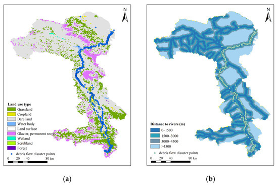 Distribution of human activities and others. (a) land use type, (b) distance to rivers.