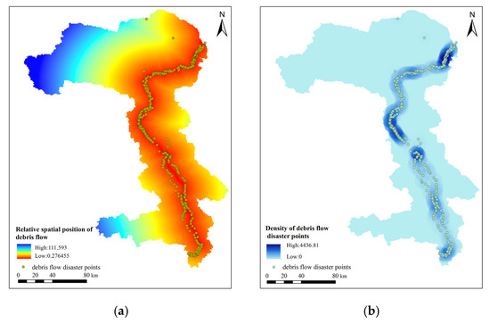 Distribution of exposure. (a) relative spatial location of debris flow, (b) density of debris flow hazard points.