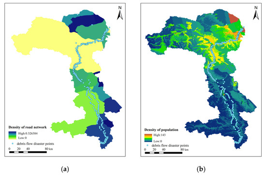 Sensitivity reflects the potential changes that disturbances may cause in socio-ecological systems. In this study, sensitivity is measured by population density and road density. Population density reflects the characteristics of regional population distribution; the lower the population density, the smaller the impact caused by debris flow disasters. Road construction is a prerequisite for economic development. Road accessibility is crucial for debris flow disaster prevention and mitigation. Higher road density indicates stronger capacity to cope with debris flow disasters. Additionally, road density is also important for social security in emergency situations, as shown in Figure 9.
