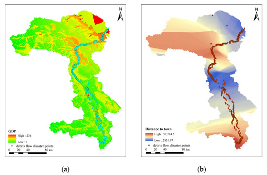 Resilience reflects the system’s ability to recover from the adverse effects caused by disturbances. In this study, resilience is measured by GDP and the distance to town. GDP mainly reflects the economic strength of a region. The larger the GDP value, the faster the recovery from the damage caused by the debris flow disasters. The closer the distance to a town, the quicker the rescue and recovery after the destruction caused by debris flows, as shown in Figure 10.