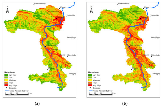 The natural breakpoint method was adopted to classify the hazard indexes into very high, high, medium, low, and very low hazard zones, according to the selected grading status of the debris flow disaster influence factors and the assessment model. The debris flow hazard grading maps of the frequency ratio model and the frequency ratio–logistic regression model were obtained, as shown in Figure 11.