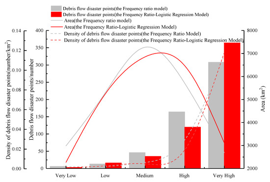 Figure 12 illustrates the variations in the distribution areas, debris flow disaster points, and disaster points density of different hazard zones for two models as the debris flow hazard level. It can be observed from the figure that the distribution areas of different hazard zones for two models initially increase and then decrease with the rise in hazard levels. Additionally, the number of debris flow disaster points and disaster points density for two models increase as the hazard level increases. However, the two models show differences in their calculation results. For the frequency ratio model, in the very high hazard zones, the distribution area, the proportion of debris flow disaster points, and the density of debris flow disaster points are 2688 km2 (11.2%), 57.4%, and 11.5 × 10−2, respectively. In the high hazard zones, these values are 5706 km2 (23.8%), 30.5%, and 2.9 × 10−2, respectively. In the medium hazard zone, these values are 7272 km2 (30.4%), 8.6%, and 0.6 × 10−2, respectively. In the low hazard zones, these values are 5312 km2 (22.2%), 2.4%, and 0.2 × 10−2, respectively. In the very low hazard zones, these values are 2982 km2 (12.4%), 1.1%, and 0.2 × 10−2, respectively. For the frequency ratio–logistic regression coupled models, in the very high hazard zones, the distribution area, the proportion of debris flow disaster points, and the density of debris flow disaster points are 3114 km2 (13%), 67.7%, and 11.7 × 10−2, respectively. In the high hazard zones, these values are 6469 km2 (27%), 22.3%, and 1.9 × 10−2, respectively. In the medium hazard zones, these values are 6852 km2 (28.6%), 6.5%, and 0.5 × 10−2, respectively. In the low hazard zones, these values are 5256 km2 (21.9%), 3%, and 0.3 × 10−2, respectively. In the very low hazard zones, these values are 2269 km2 (9.5%), 0.6%, and 0.1 × 10−2, respectively.