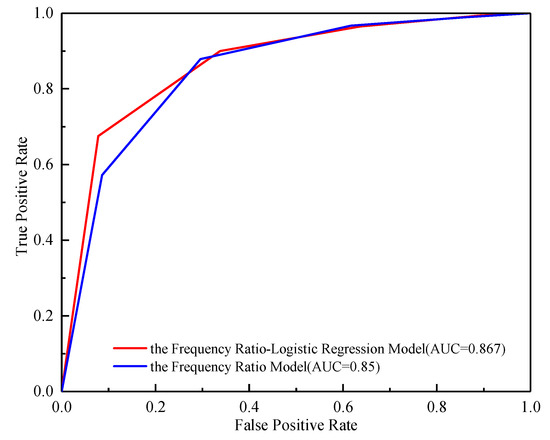 To evaluate the reliability of the model, Figure 13 presents the ROC curves of the frequency ratio model and the frequency ratio–logistic regression coupled model. The AUC values for the two models are 0.85 and 0.867, respectively, which shows that the accuracy of the coupled model is slightly higher than the single model. Therefore, the hazard results obtained from the frequency ratio–logistic regression coupled model is more accurate.